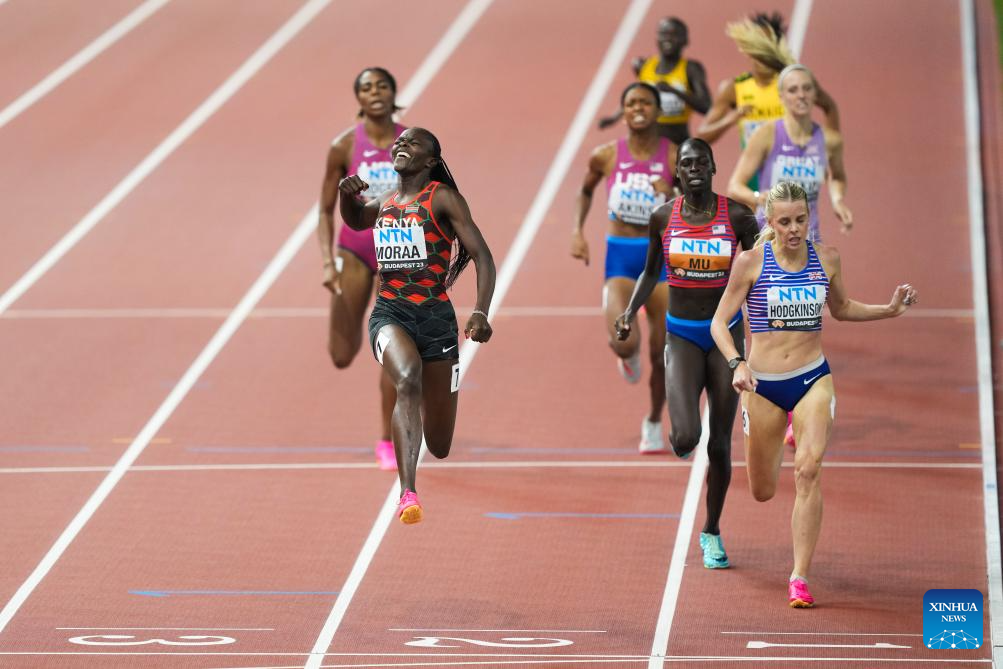 Mary Moraa (front L) of Kenya celebrates as she crosses the finish line during the Women's 800m Final of the World Athletics Championships Budapest 2023 in Budapest, Hungary, Aug. 27, 2023. (Xinhua/Zheng Huansong)