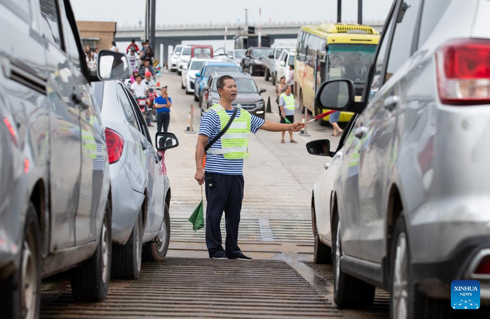 This photo taken on July 1, 2023 shows Zhong Helin, a sailor of the cross-river vehicle ferry linking Nixi Town and Juexi Town in Xuzhou District of Yibin in southwest China's Sichuan Province, directing vehicles on the deck. The cross-river vehicle ferry service that links Nixi Town and Juexi Town in Xuzhou District of Yibin started in May of 1992. This ferry service has been one of the most important transportation methods for local people living nearby on both sides of Minjiang River.