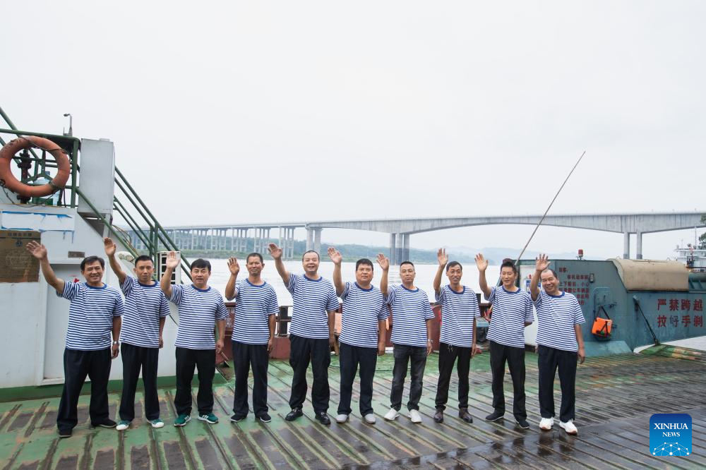 Sailors pose for a group photo on the cross-river vehicle ferry linking Nixi Town and Juexi Town in Xuzhou District of Yibin, southwest China's Sichuan Province, Aug. 28, 2023. The cross-river vehicle ferry service that links Nixi Town and Juexi Town in Xuzhou District of Yibin started in May of 1992. This ferry service has been one of the most important transportation methods for local people living nearby on both sides of Minjiang River.