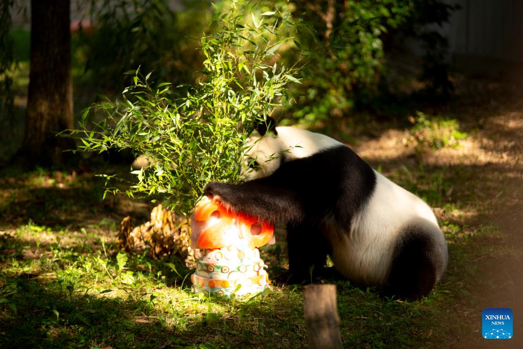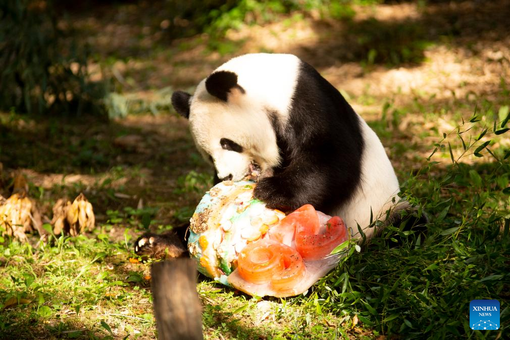 Giant panda Tian Tian enjoys an ice cake at Smithsonian's National Zoo in Washington, D.C., the United States, on Aug. 27, 2023. Giant panda Tian Tian celebrated his 26th birthday at the zoo on Sunday. (Photo by Winstead Barnes/Xinhua)