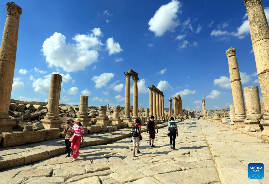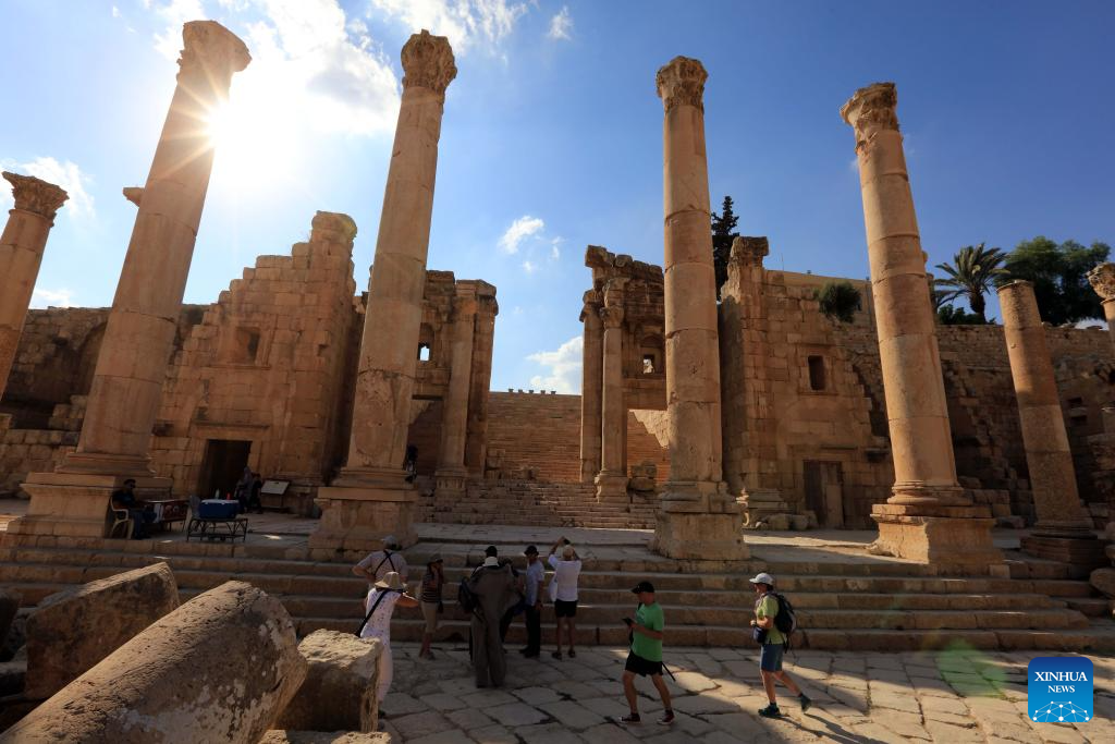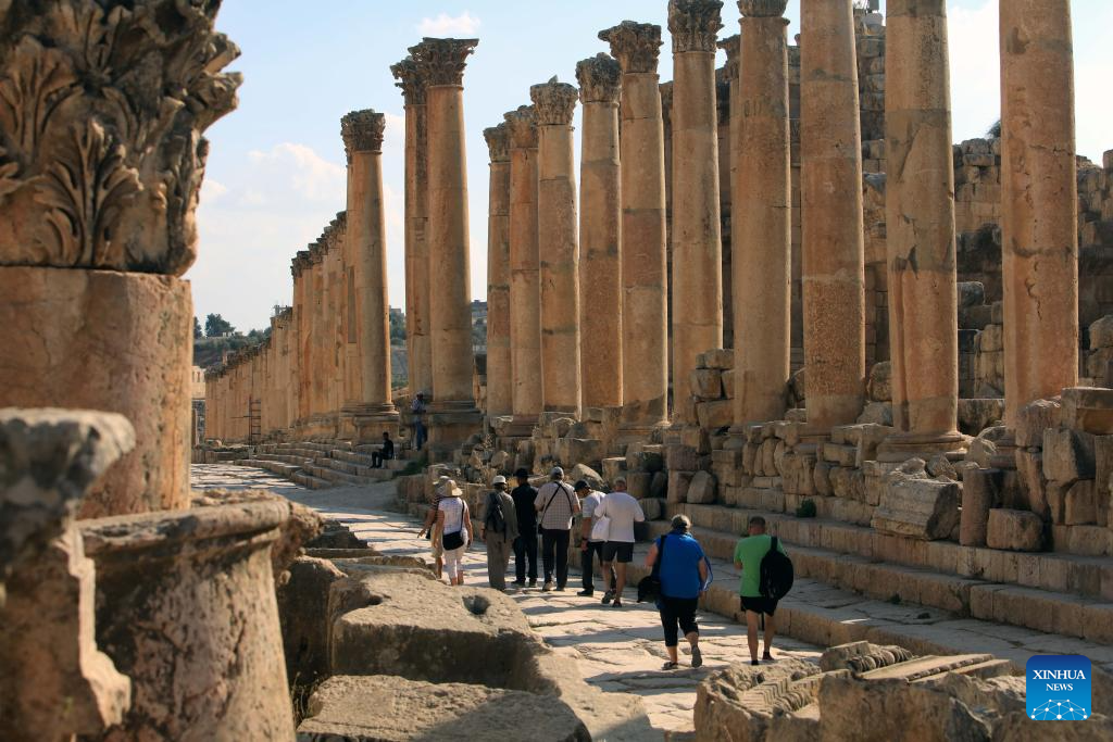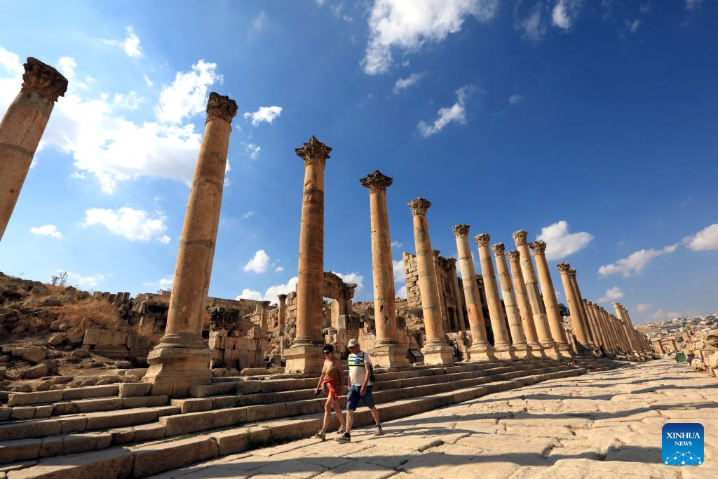 Tourists visit a Roman archeological site in Jerash, Jordan, on Aug. 28, 2023. (Photo by Mohammad Abu Ghosh/Xinhua)
