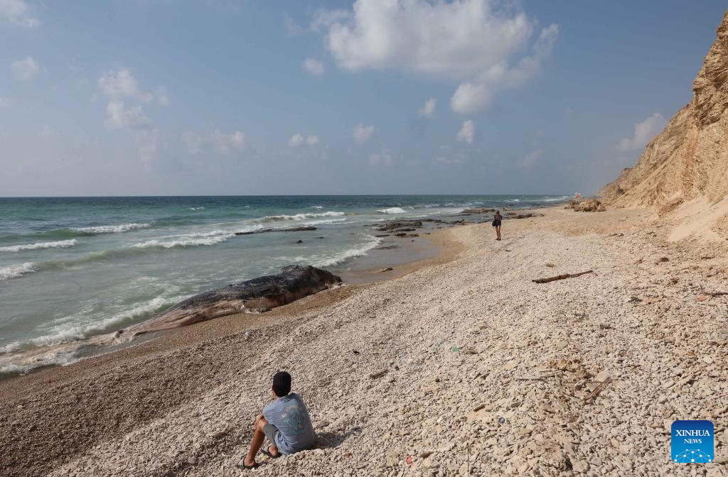 This photo taken on Aug. 28, 2023 shows the carcass of a 10-meter-long sperm whale on Ga'ash Beach, to the north of Tel Aviv, Israel. (Photo by Gil Cohen Magen/Xinhua)