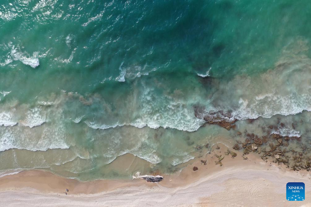 This aerial photo taken on Aug. 28, 2023 shows the carcass of a 10-meter-long sperm whale on Ga'ash Beach, to the north of Tel Aviv, Israel. (Photo by Gil Cohen Magen/Xinhua)
