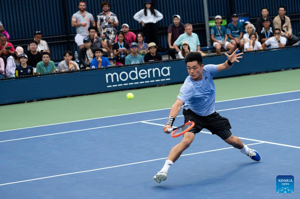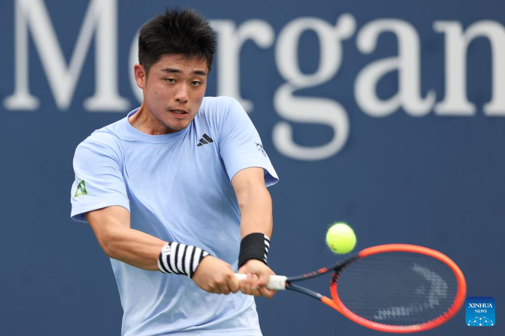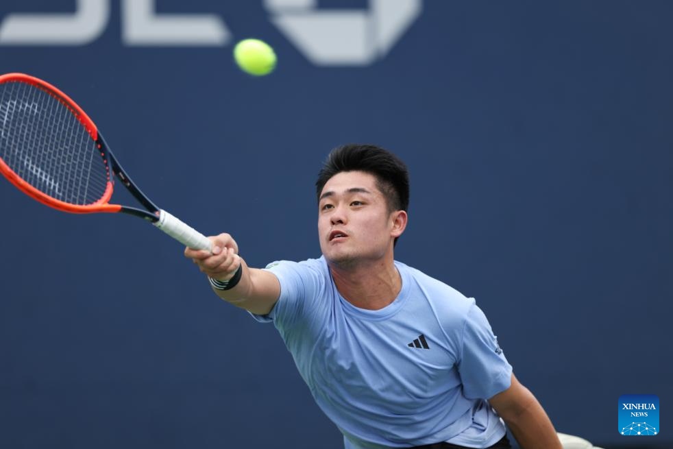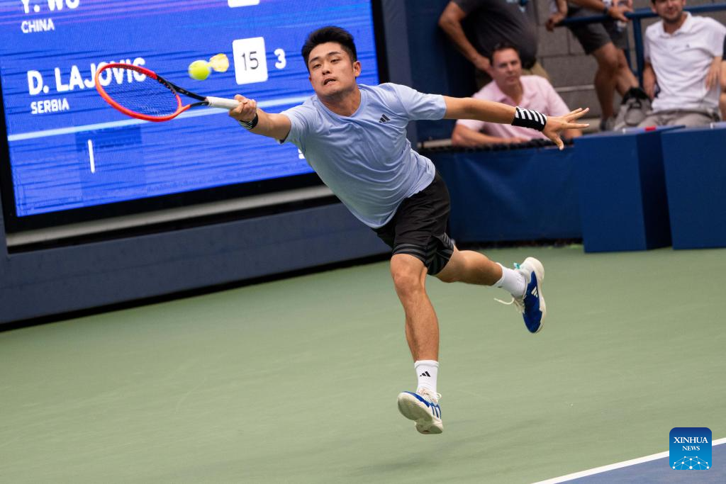 Wu Yibing of China hits a return during the men's singles first round match against Dusan Lajovic of Serbia at the 2023 US Open tennis championships in New York, the United States, Aug. 29, 2023. (Xinhua/Liu Jie)