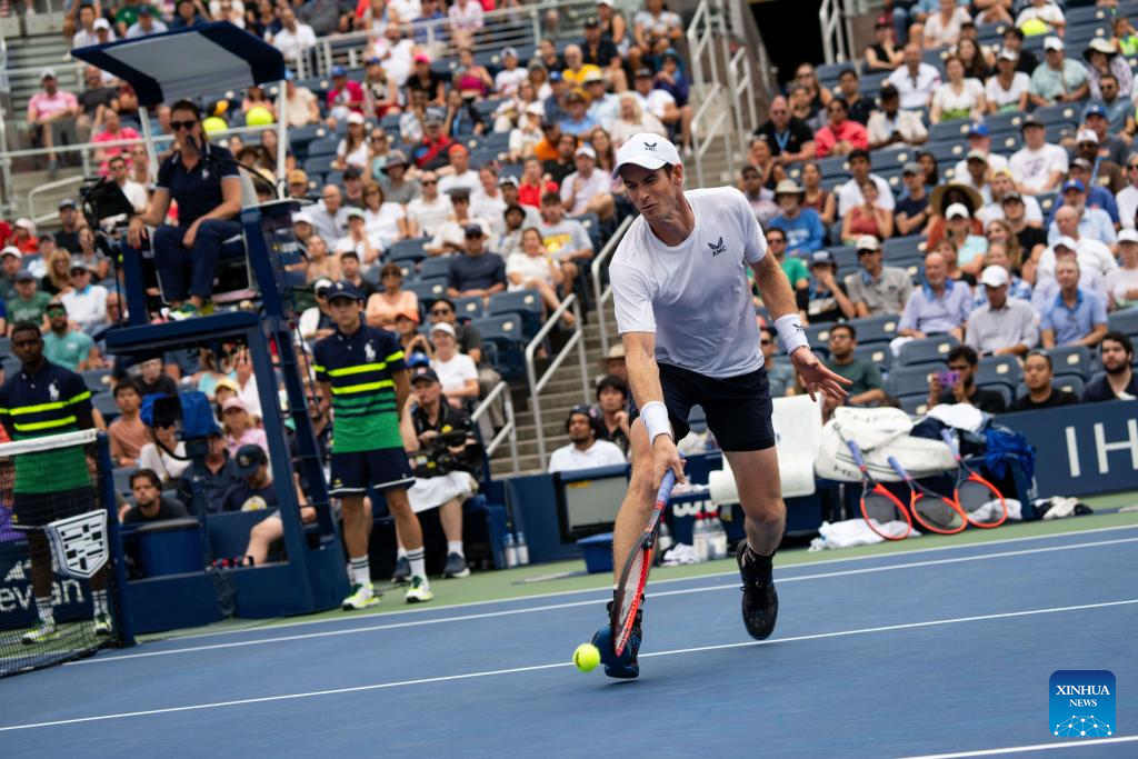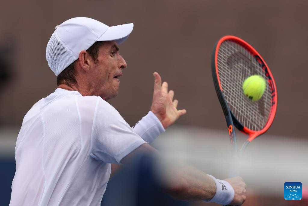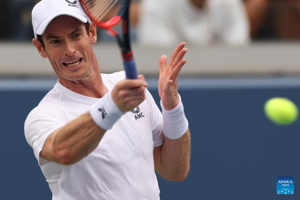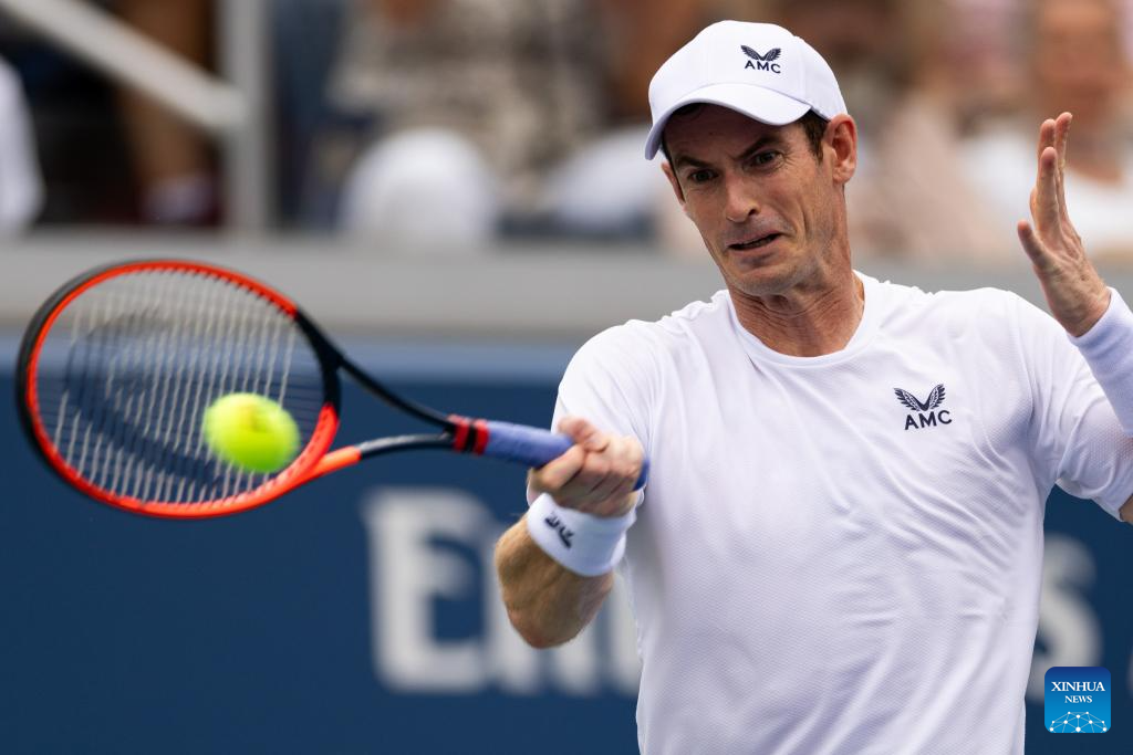 Andy Murray of Britain hits a return during the men's singles first round match against Corentin Moutet of France at the 2023 US Open tennis championships in New York, the United States, Aug. 29, 2023. (Xinhua/Liu Jie)