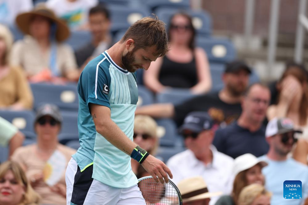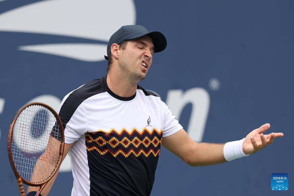 Dusan Lajovic of Serbia reacts during the men's singles first round match against Wu Yibing of China at the 2023 US Open tennis championships in New York, the United States, Aug. 29, 2023. (Xinhua/Liu Jie)