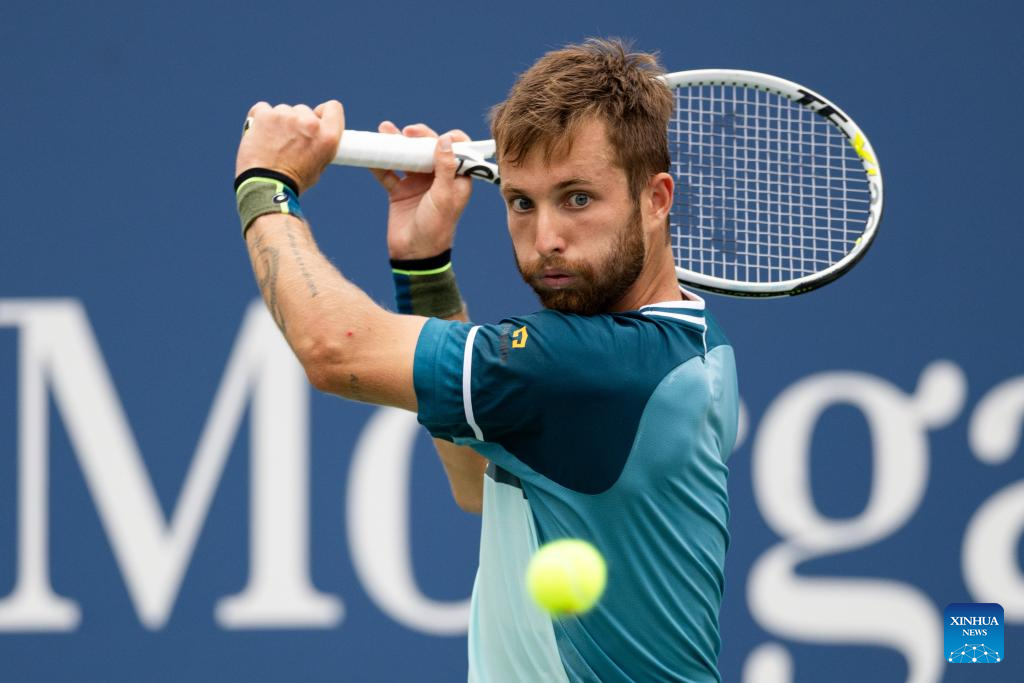 Corentin Moutet of France hits a return during the men's singles first round match against Andy Murray of Britain at the 2023 US Open tennis championships in New York, the United States, Aug. 29, 2023. (Xinhua/Liu Jie)
