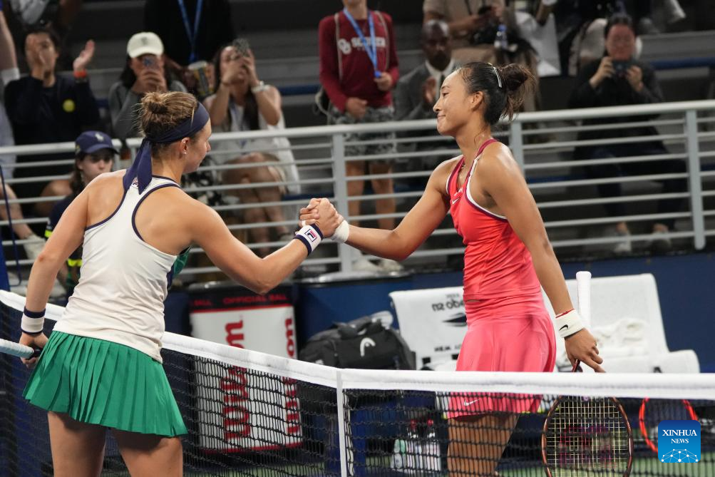 Zheng Qinwen (R) of China shakes hands with Nadia Podoroska of Argentina after their women's singles first round match at the 2023 US Open tennis championships in New York, the United States, Aug. 29, 2023. (Xinhua/Liu Jie)