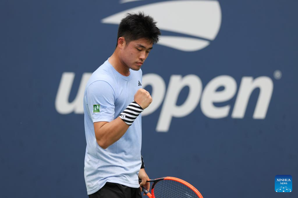 Wu Yibing of China celebrates during the men's singles first round match against Dusan Lajovic of Serbia at the 2023 US Open tennis championships in New York, the United States, Aug. 29, 2023. (Xinhua/Liu Jie)