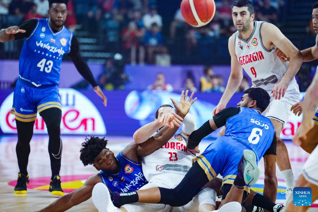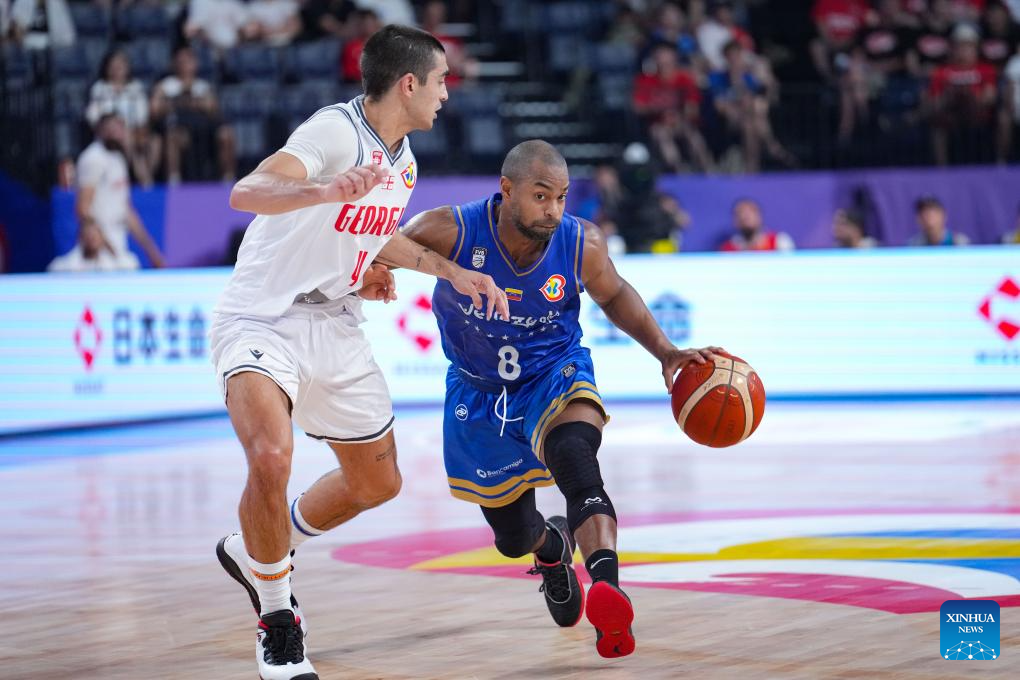 Venezuela's David Cubillan (R) breaks through during the group F first round match between Georgia and Venezuela at the FIBA World Cup 2023 in Okinawa, Japan, Aug. 30, 2023. (Xinhua/Zhang Xiaoyu)