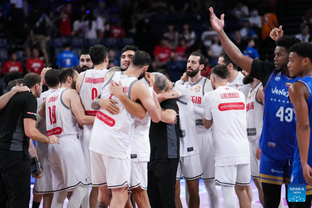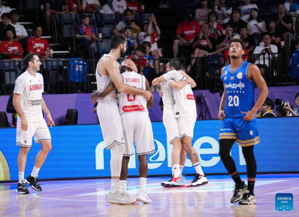Georgia's players celebrate winning the group F first round match between Georgia and Venezuela at the FIBA World Cup 2023 in Okinawa, Japan, Aug. 30, 2023. (Xinhua/Zhang Xiaoyu)