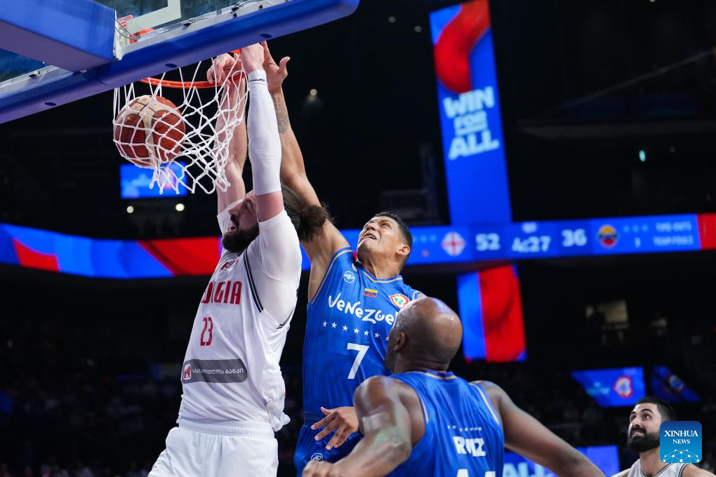 Georgia's Tornike Shengelia (1st L) dunks during the group F first round match between Georgia and Venezuela at the FIBA World Cup 2023 in Okinawa, Japan, Aug. 30, 2023. (Xinhua/Zhang Xiaoyu)