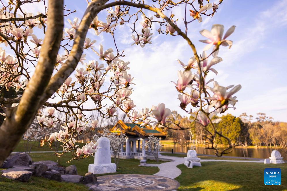 This photo taken on Aug. 30, 2023 shows magnolia flowers at the Beijing Garden by Lake Burley Griffin in Canberra, Australia. The Beijing Garden, completed in 2014, is a precious gift from the municipal government of China's capital Beijing to its sister city of Canberra. (Photo by Chu Chen/Xinhua)