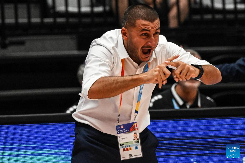 Jad El Hajj, head coach of Lebanon, reacts during the Group P classification round 17-32 match between Cote d'Ivoire and Lebanon at the FIBA World Cup 2023 in Jakarta, Indonesia, Aug. 31, 2023. (Xinhua/Agung Kuncahya B.)