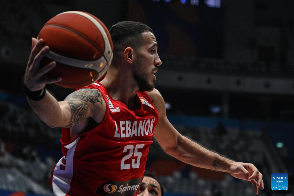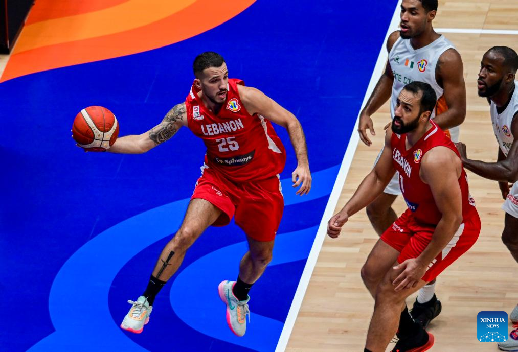 Ali Mezher (1st L) of Lebanon passes the ball during the Group P classification round 17-32 match between Cote d'Ivoire and Lebanon at the FIBA World Cup 2023 in Jakarta, Indonesia, Aug. 31, 2023. (Xinhua/Zulkarnain)