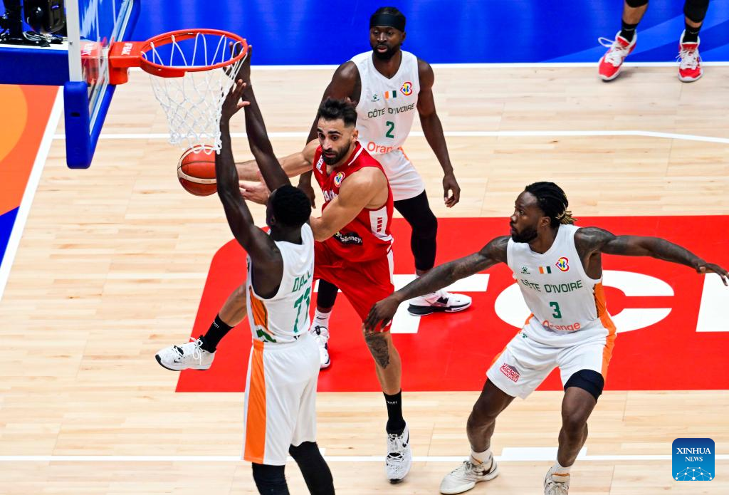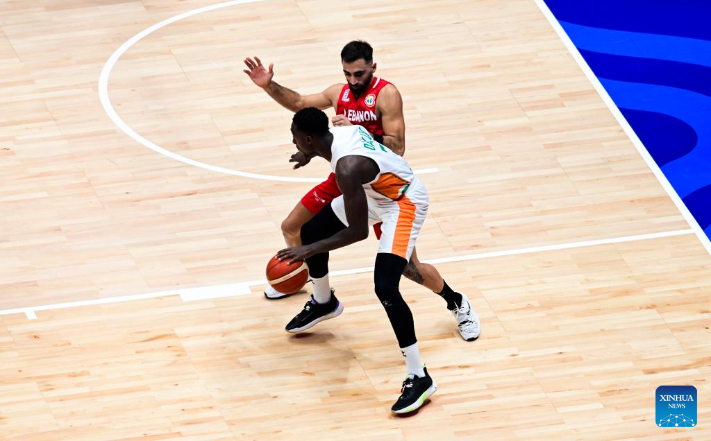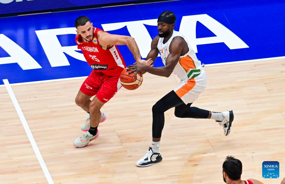 Jean Philippe Dally (L) of Cote d'Ivoire vies with Karim Zeinoun of Lebanon during the Group P classification round 17-32 match between Cote d'Ivoire and Lebanon at the FIBA World Cup 2023 in Jakarta, Indonesia, Aug. 31, 2023. (Xinhua/Zulkarnain)