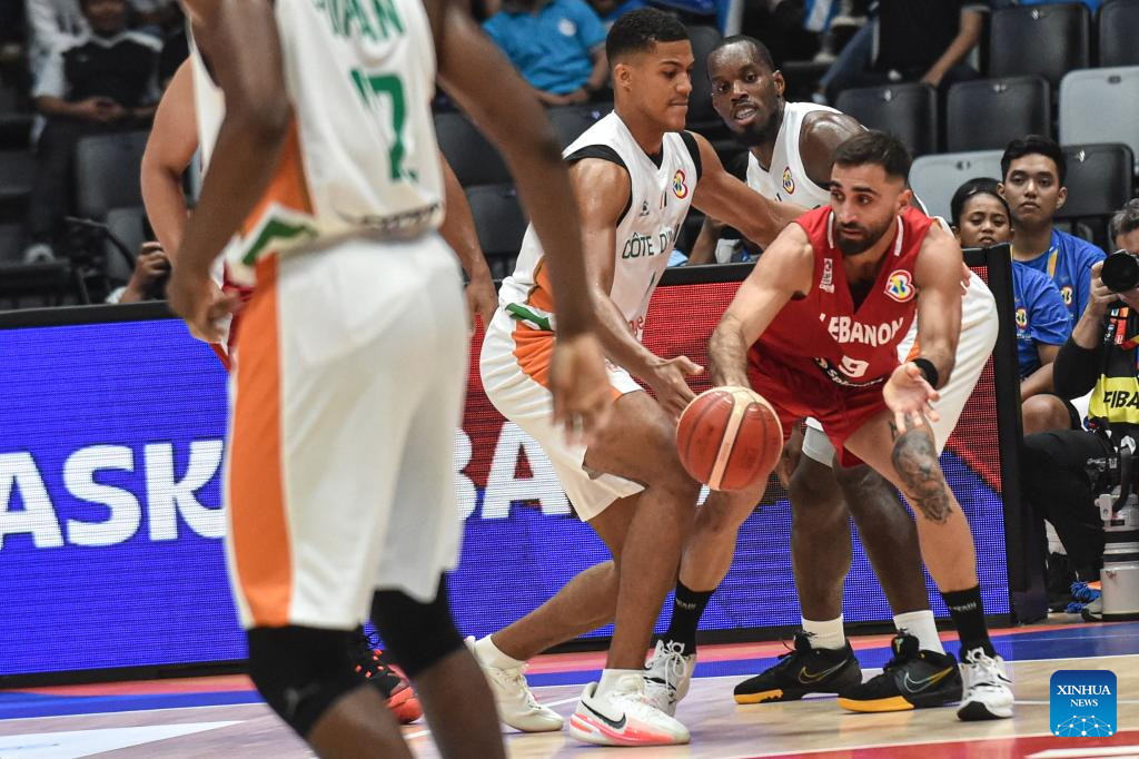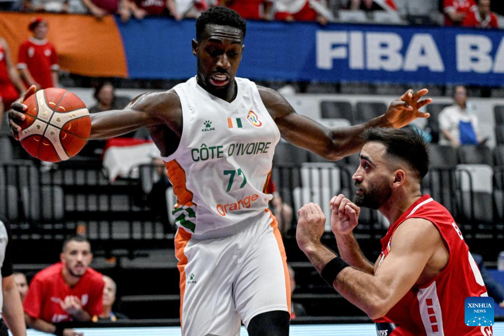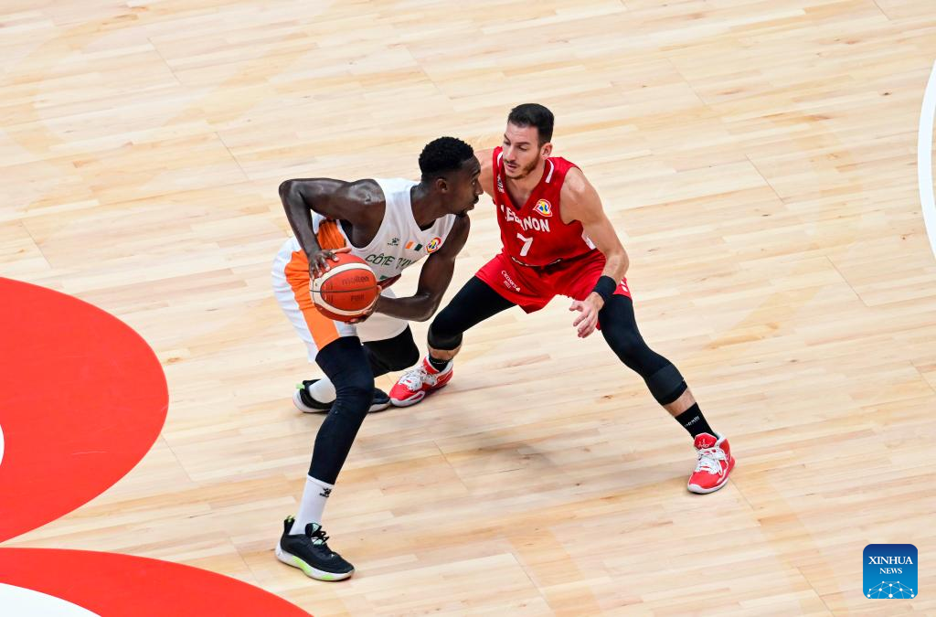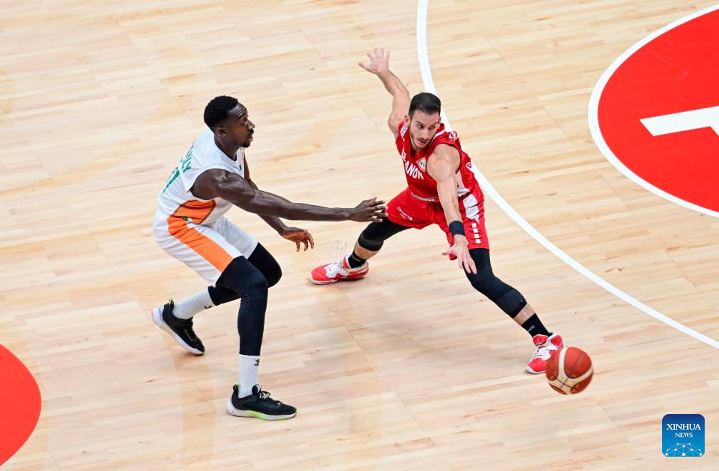 Jean Philippe Dally (L) of Cote d'Ivoire passes the ball during the Group P classification round 17-32 match between Cote d'Ivoire and Lebanon at the FIBA World Cup 2023 in Jakarta, Indonesia, Aug. 31, 2023. (Xinhua/Agung Kuncahya B.)