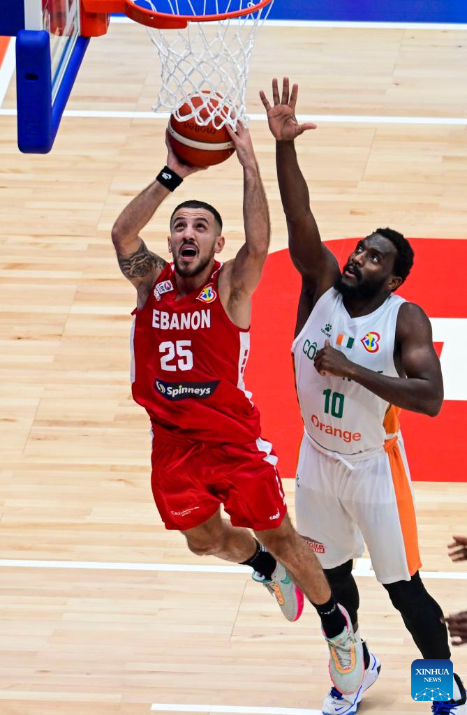 Ali Mezher (L) of Lebanon goes up for a lay-up during the Group P classification round 17-32 match between Cote d'Ivoire and Lebanon at the FIBA World Cup 2023 in Jakarta, Indonesia, Aug. 31, 2023. (Xinhua/Zulkarnain)
