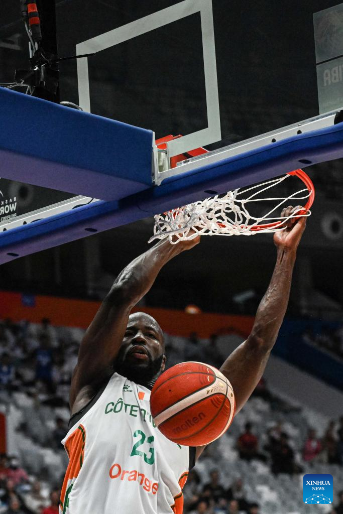 Cedric Bah of Cote d'Ivoire dunks during the Group P classification round 17-32 match between Cote d'Ivoire and Lebanon at the FIBA World Cup 2023 in Jakarta, Indonesia, Aug. 31, 2023. (Xinhua/Agung Kuncahya B.)