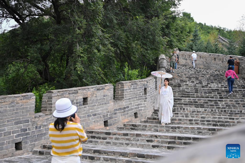 This photo taken on Aug. 29, 2023 shows people visiting the Yanmen Pass in Daixian County, north China's Shanxi Province. The Yanmen Pass is a famed part of the Great Wall. The Great Wall, a UNESCO World Heritage Site, consists of many interconnected walls, some dating back 2,000 years. (Xinhua/Yang Chenguang)