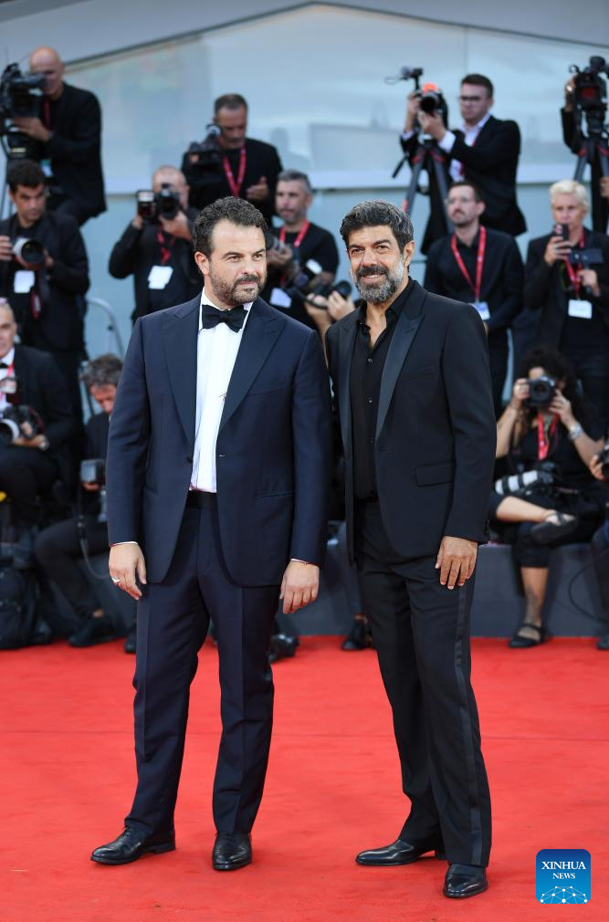 Director Edoardo De Angelis (L) and actor Pierfrancesco Favino pose on the red carpet of the 80th Venice International Film Festival in Venice, Italy, Aug. 30, 2023. The 80th annual Venice International Film Festival kicked off here on Wednesday evening, with a diverse line-up of movies competing for the prestigious Golden Lion prize. (Xinhua/Jin Mamengni)
