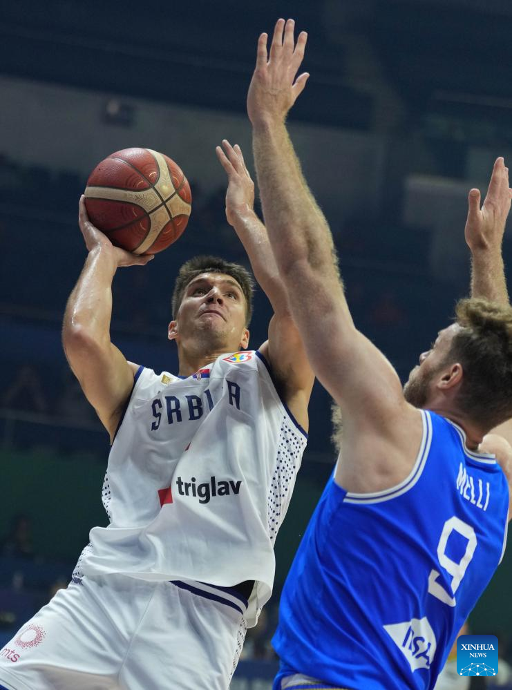 Bogdan Bogdanovic (L) of Serbia shoots during the second round match between Serbia and Italy at the 2023 FIBA World Cup in Manila, the Philippines, Sept. 1, 2023. (Xinhua/Meng Yongmin)