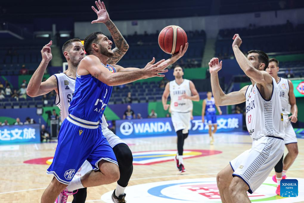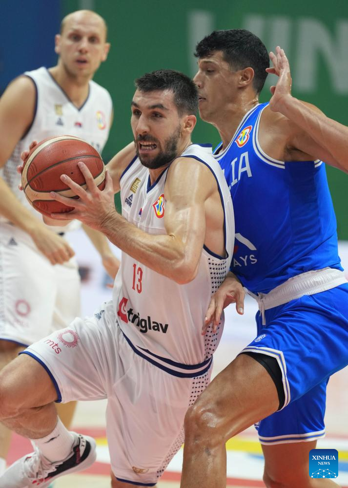 Ognjen Dobric (front, L) of Serbia breaks through during the second round match between Serbia and Italy at the 2023 FIBA World Cup in Manila, the Philippines, Sept. 1, 2023. (Xinhua/Meng Yongmin)