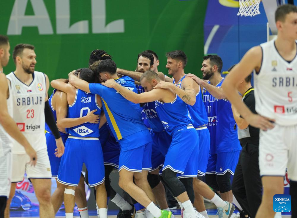 Players of Italy celebrate victory after the second round match between Serbia and Italy at the 2023 FIBA World Cup in Manila, the Philippines, Sept. 1, 2023. (Xinhua/Meng Yongmin)
