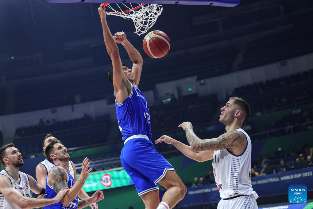 Ognjen Dobric (top) of Serbia goes for a lay-up during the second round match between Serbia and Italy at the 2023 FIBA World Cup in Manila, the Philippines, Sept. 1, 2023. (Xinhua/Meng Yongmin)