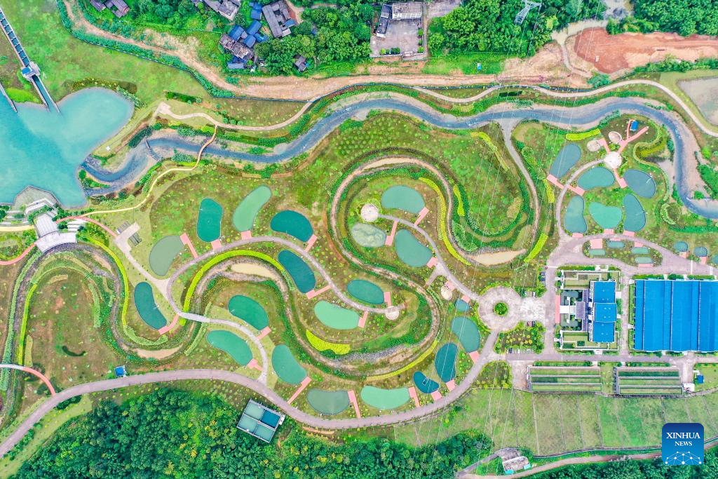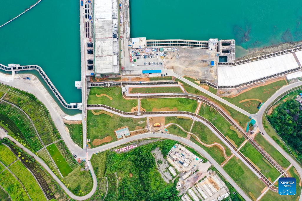 This aerial photo taken on Sept. 2, 2023 shows the fishway and supporting facilities at the auxiliary dam of the Dateng Gorge Water Conservancy project in Guiping City, south China's Guangxi Zhuang Autonomous Region. The Dateng Gorge Water Conservancy project, started in 2014, is a crucial part of the country's water network to control floods, facilitate shipping, generate electricity, and provide irrigation. The core construction phase of this project was completed on Saturday. (Xinhua/Cao Yiming)