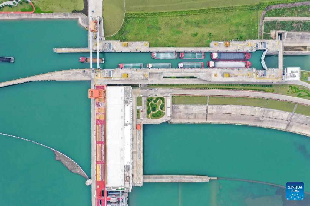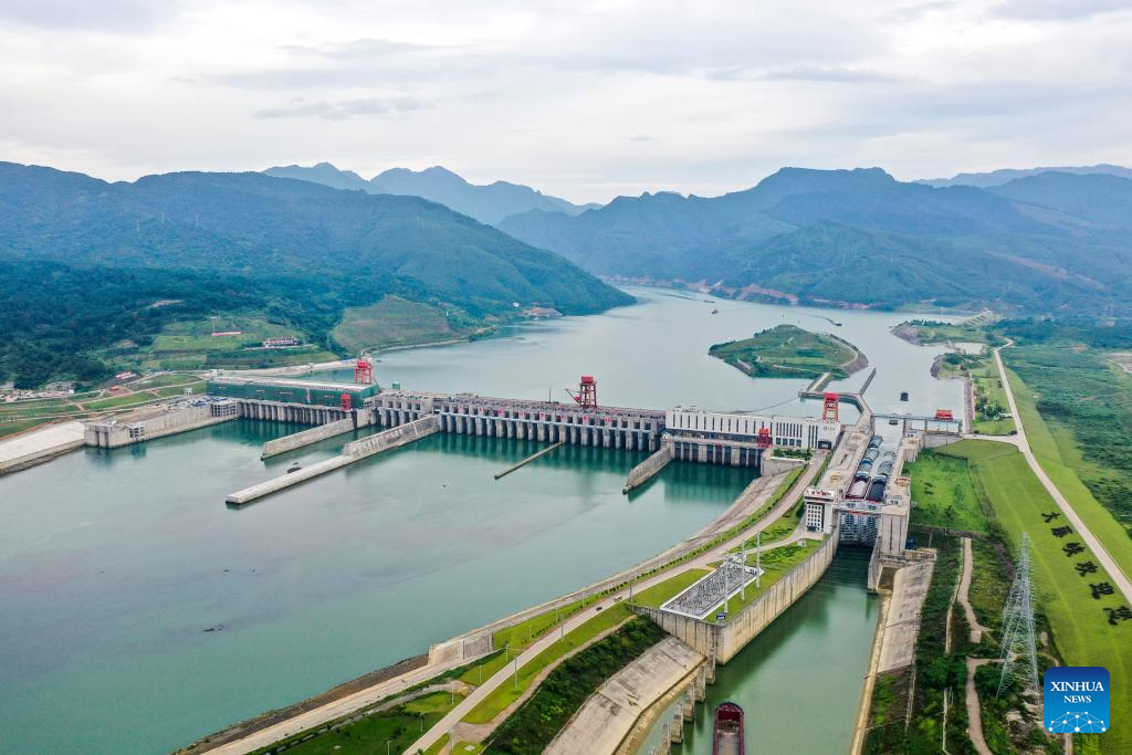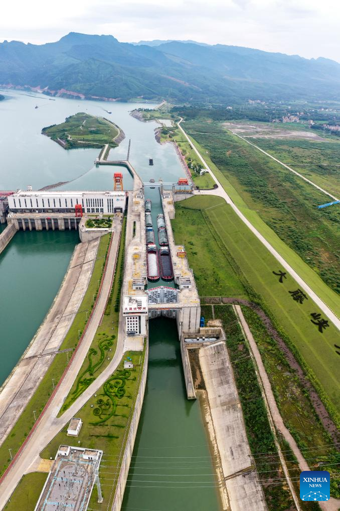 This aerial photo taken on Sept. 2, 2023 shows the ship lock of the Dateng Gorge Water Conservancy project in Guiping City, south China's Guangxi Zhuang Autonomous Region. The Dateng Gorge Water Conservancy project, started in 2014, is a crucial part of the country's water network to control floods, facilitate shipping, generate electricity, and provide irrigation. The core construction phase of this project was completed on Saturday. (Xinhua/Cao Yiming)