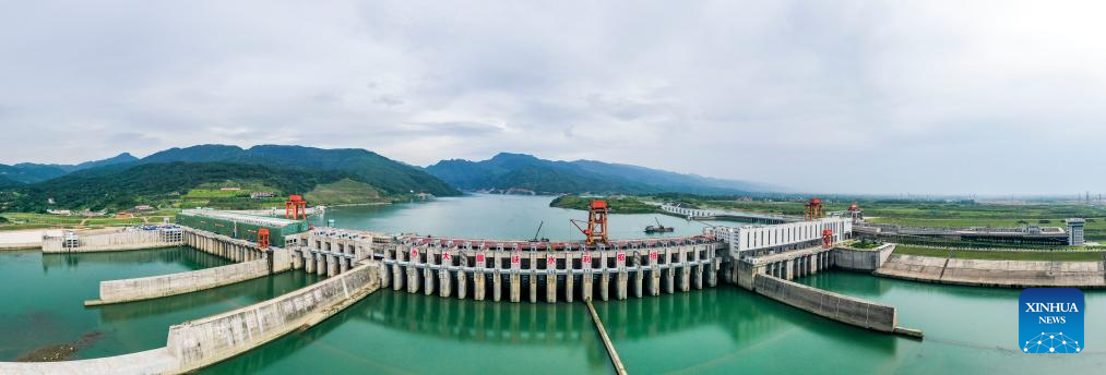This aerial photo taken on Sept. 2, 2023 shows water sluice gates of the Dateng Gorge Water Conservancy project in Guiping City, south China's Guangxi Zhuang Autonomous Region. The Dateng Gorge Water Conservancy project, started in 2014, is a crucial part of the country's water network to control floods, facilitate shipping, generate electricity, and provide irrigation. The core construction phase of this project was completed on Saturday. (Xinhua/Cao Yiming)