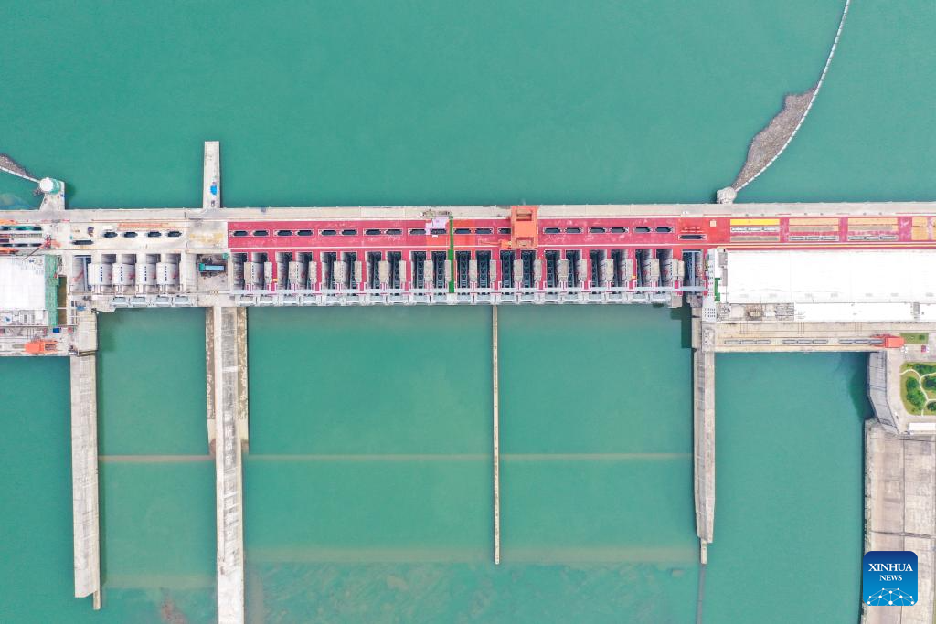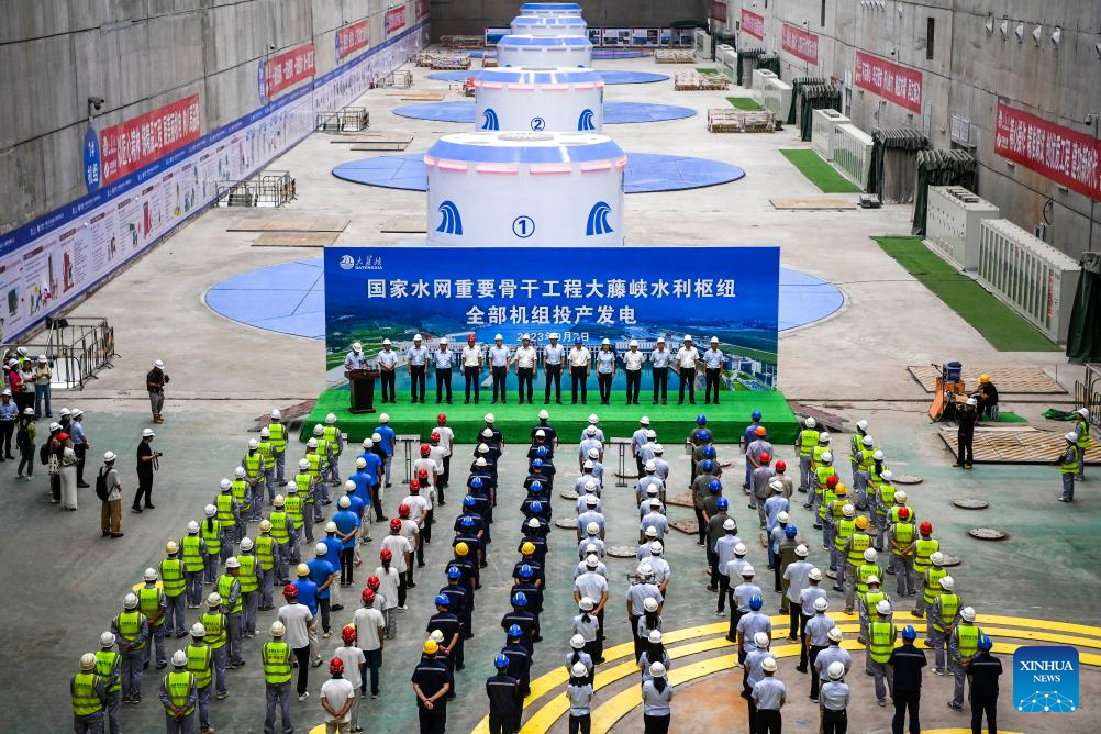 This photo taken on Sept. 2, 2023 shows the ceremony in celebration of all power generator units being put into operation at the Dateng Gorge Water Conservancy project in Guiping City, south China's Guangxi Zhuang Autonomous Region. The Dateng Gorge Water Conservancy project, started in 2014, is a crucial part of the country's water network to control floods, facilitate shipping, generate electricity, and provide irrigation. The core construction phase of this project was completed on Saturday. (Xinhua/Cao Yiming)