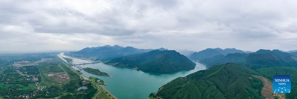 This aerial panoramic photo taken on Sept. 2, 2023 shows the Dateng Gorge Water Conservancy project in Guiping City, south China's Guangxi Zhuang Autonomous Region. The Dateng Gorge Water Conservancy project, started in 2014, is a crucial part of the country's water network to control floods, facilitate shipping, generate electricity, and provide irrigation. The core construction phase of this project was completed on Saturday. (Xinhua/Cao Yiming)