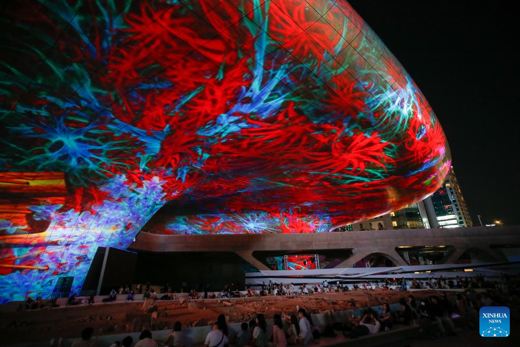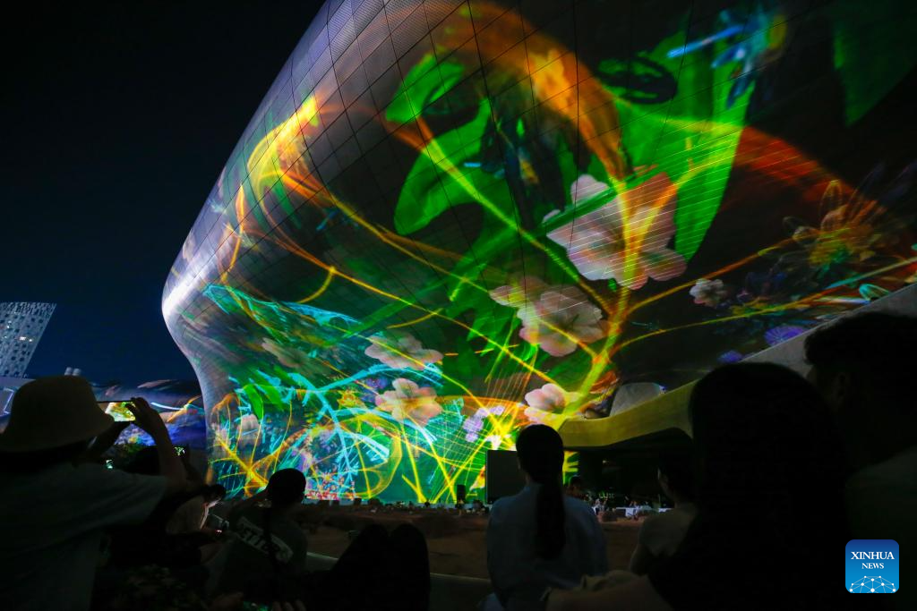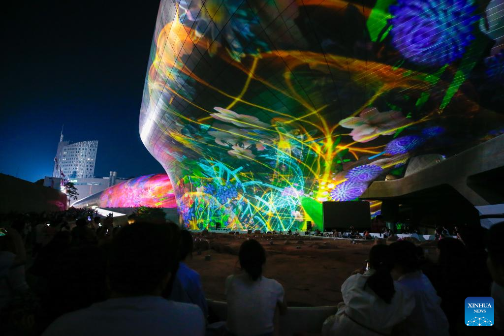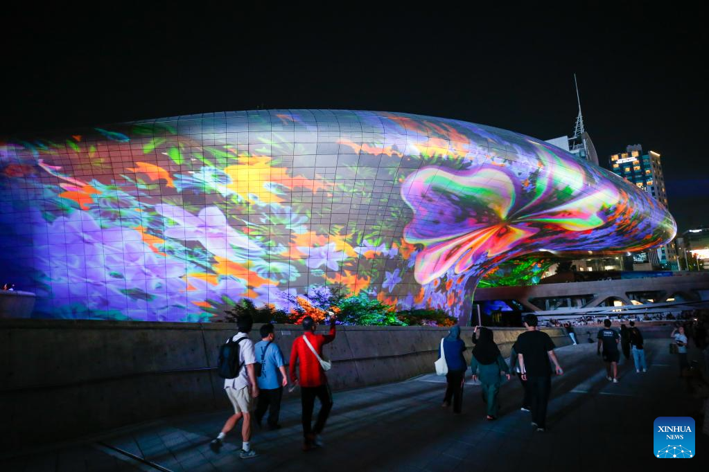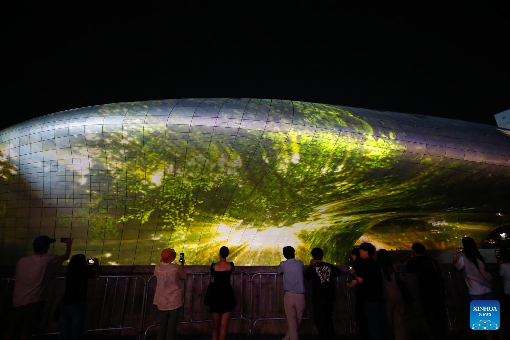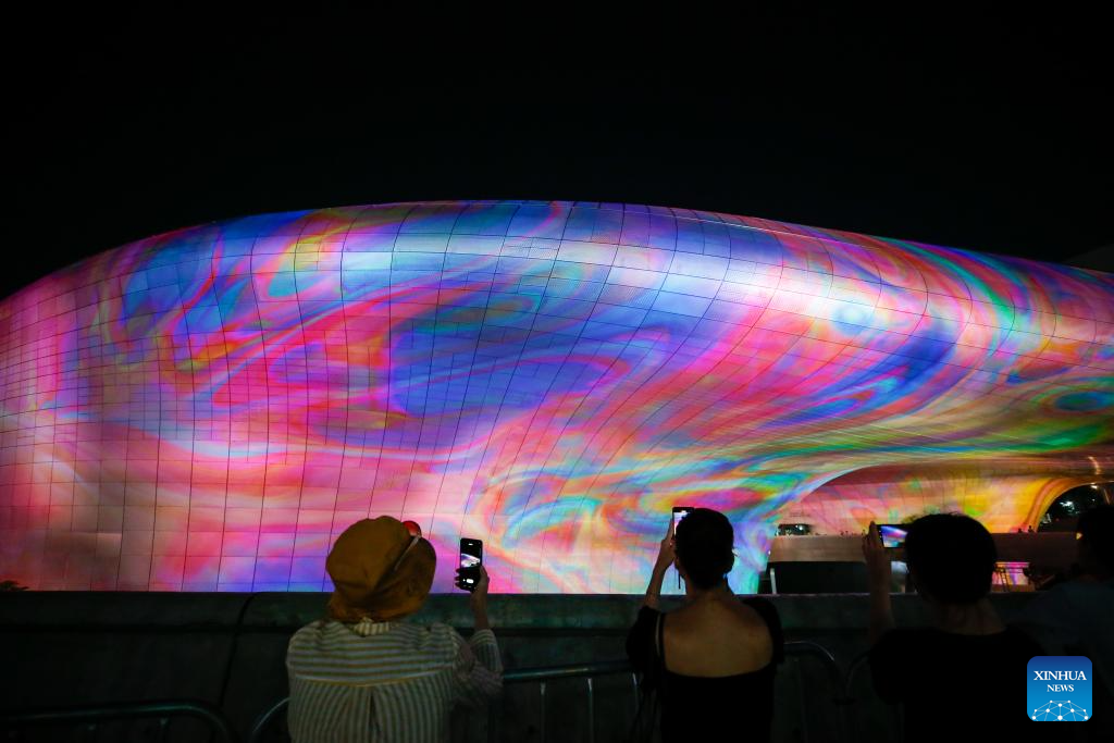 People enjoy the "SEOUL LIGHT 2023 AUTUMN" light show at Dongdaemun Design Plaza in Seoul, South Korea, Sept. 1, 2023. The light show kicked off on Thursday and will last until Sept. 10. (Xinhua/Wang Yiliang)