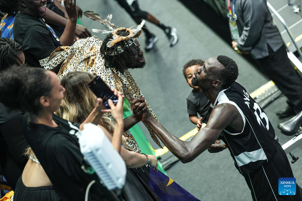 Majok Deng (R) of South Sudan makes joke with a fan of South Sudan after winning the classification round 17-32 match between Angola and South Sudan at the 2023 FIBA World Cup in Manila, the Philippines, Sept. 2, 2023. (Xinhua/Wu Zhuang)