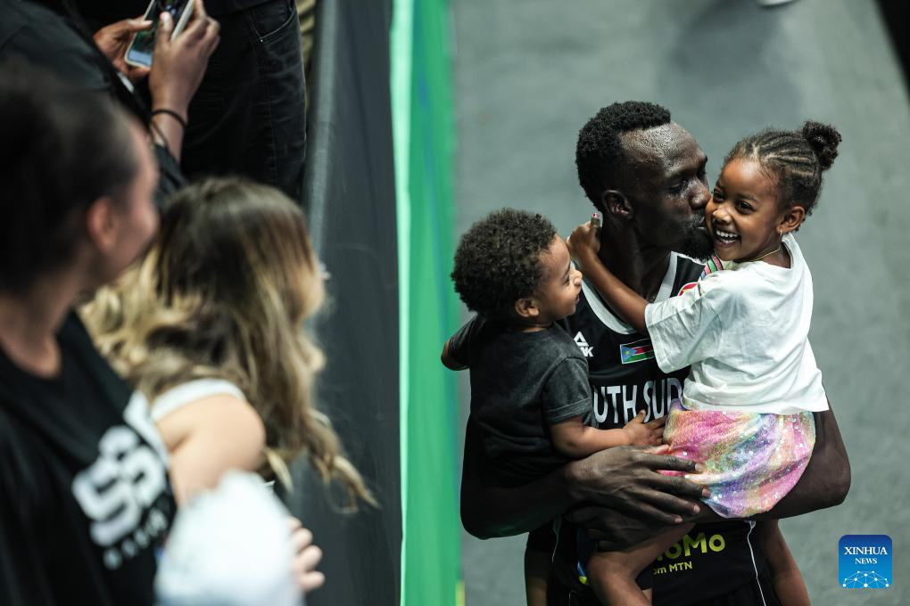 Majok Deng (C) of South Sudan kisses his daughter after winning the classification round 17-32 match between Angola and South Sudan at the 2023 FIBA World Cup in Manila, the Philippines, Sept. 2, 2023. (Xinhua/Wu Zhuang)
