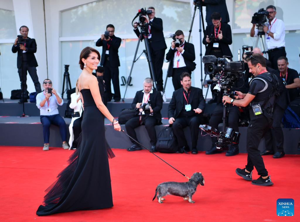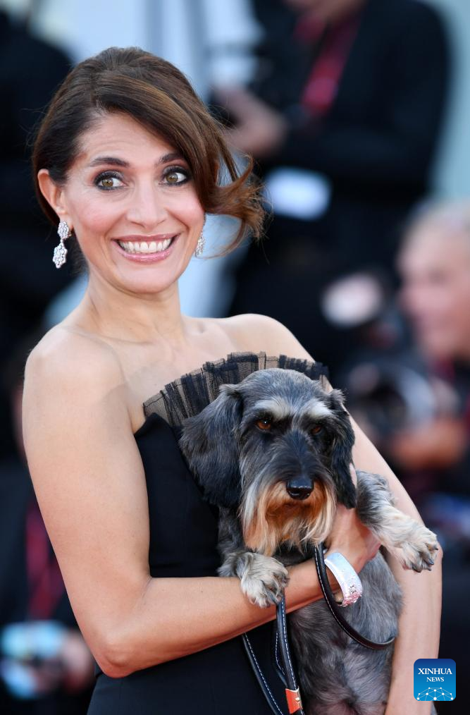 Actress Caterina Murino gestures next to her dog on the red carpet for the premiere of the film "Poor Things" during the 80th Venice International Film Festival in Venice, Italy, on Sept. 1, 2023. (Xinhua/Jin Mamengni)