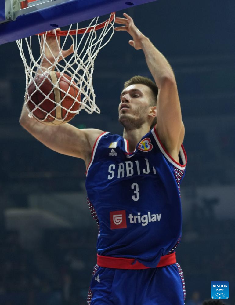 Filip Petrusev of Serbia dunks during the second round match between Dominican Republic and Serbia at the 2023 FIBA World Cup in Manila, the Philippines, Sept. 3, 2023. (Xinhua/Meng Yongmin)