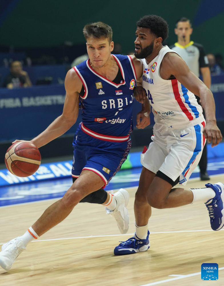 Bogdan Bogdanovic (L) of Serbia competes during the second round match between Dominican Republic and Serbia at the 2023 FIBA World Cup in Manila, the Philippines, Sept. 3, 2023. (Xinhua/Meng Yongmin)