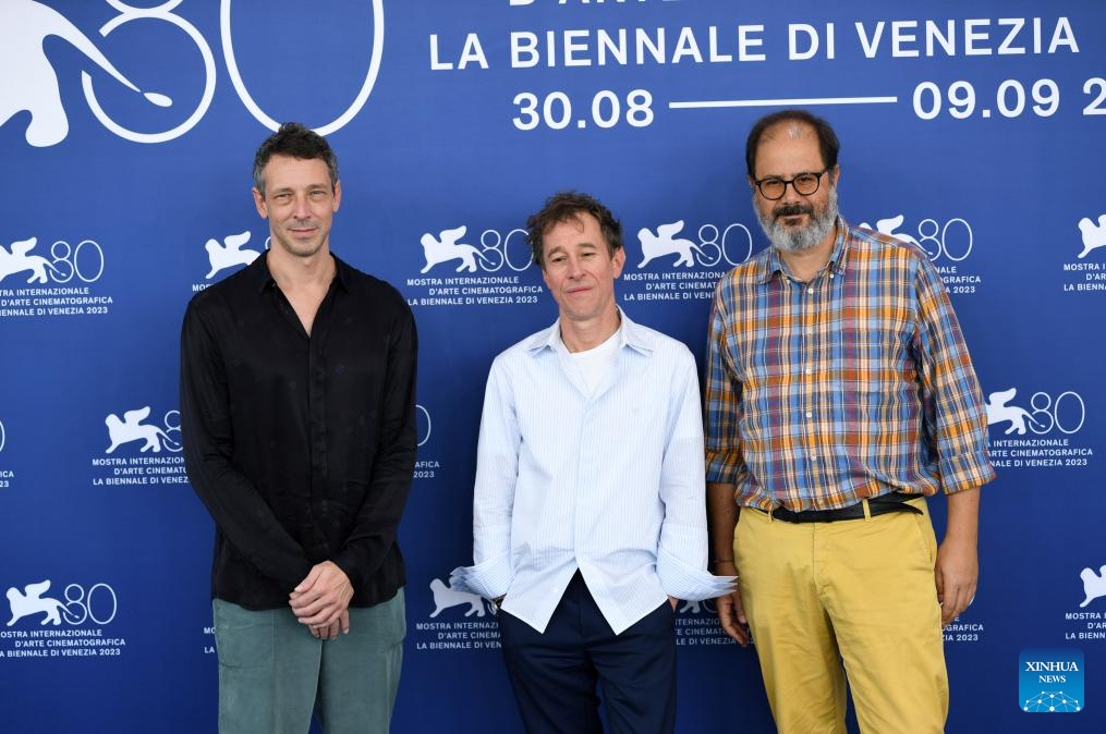 Director Bertrand Bonello (C) and his crew members attend a photocall for the film "La bete" during the 80th Venice International Film Festival in Venice, Italy, Sept. 3, 2023. (Xinhua/Jin Mamengni)
