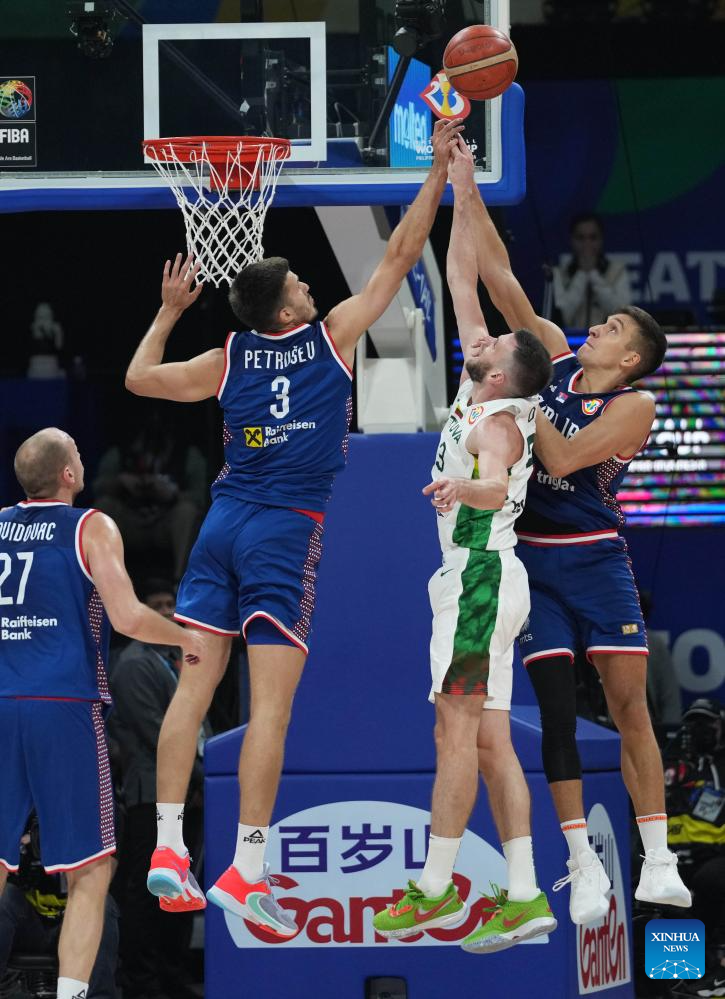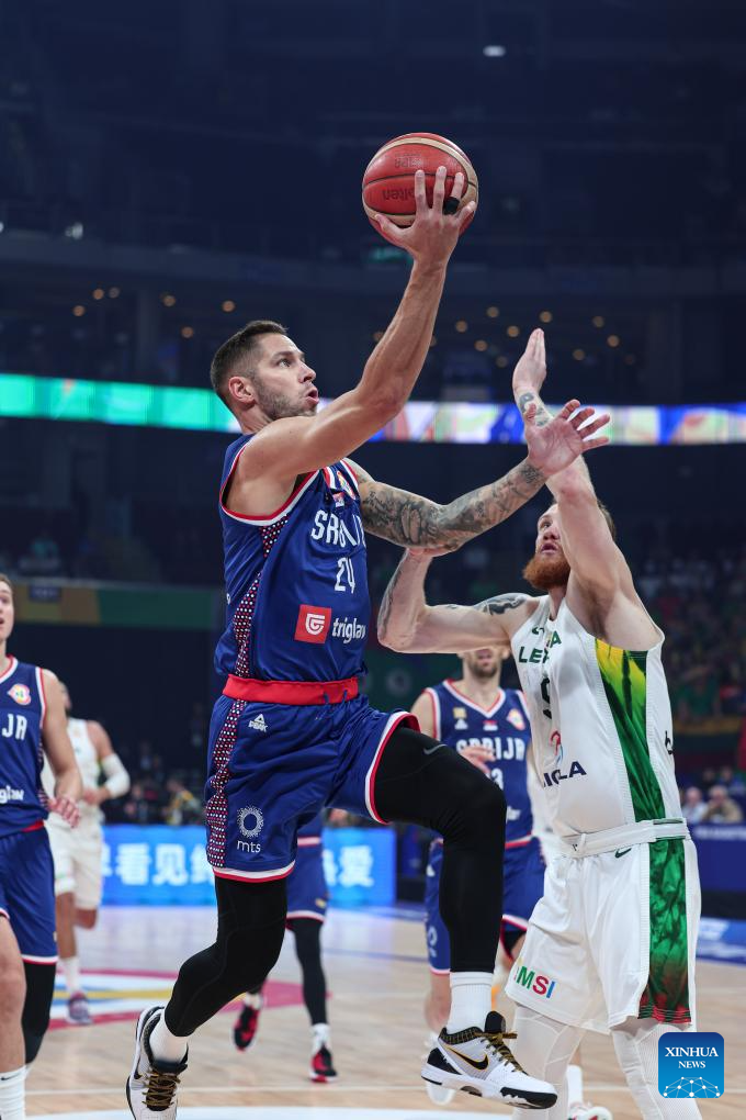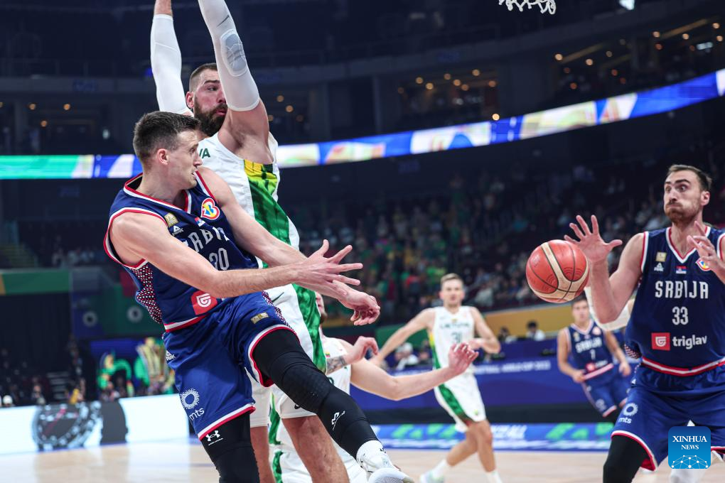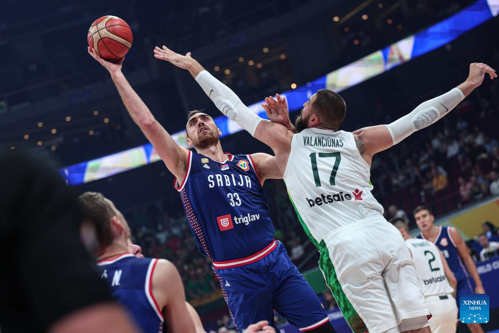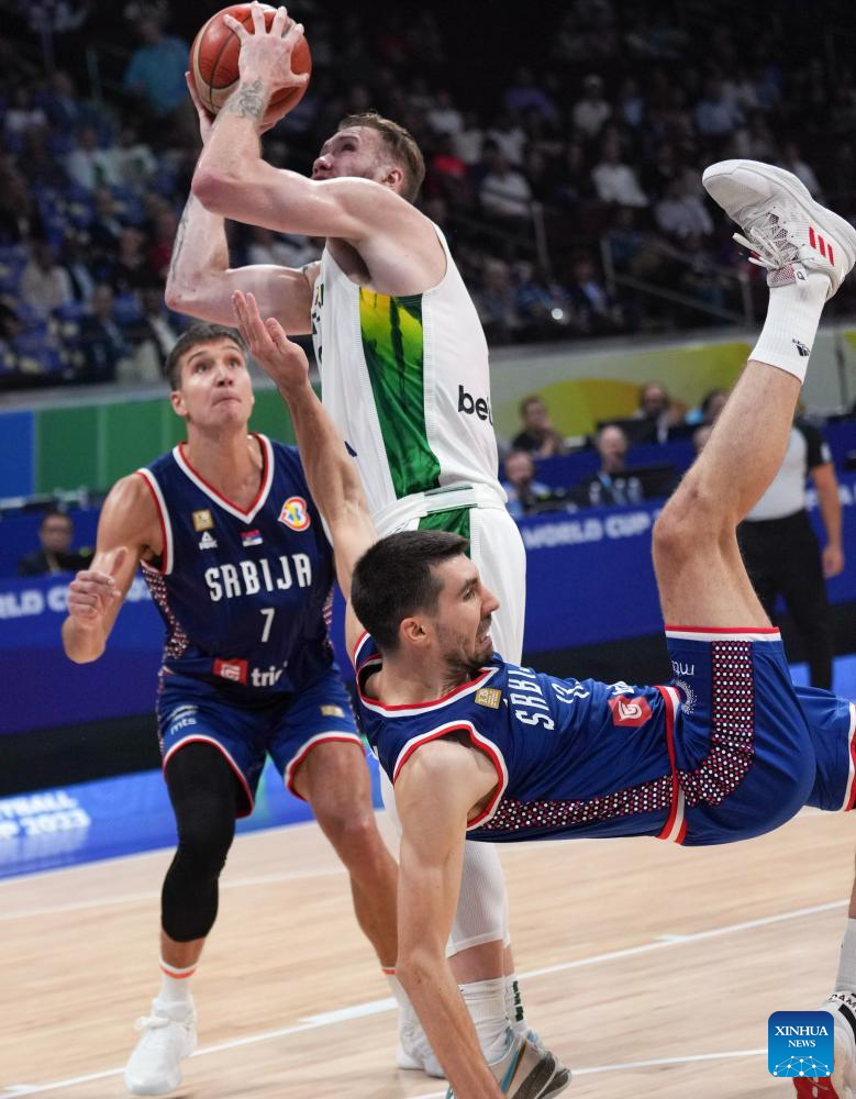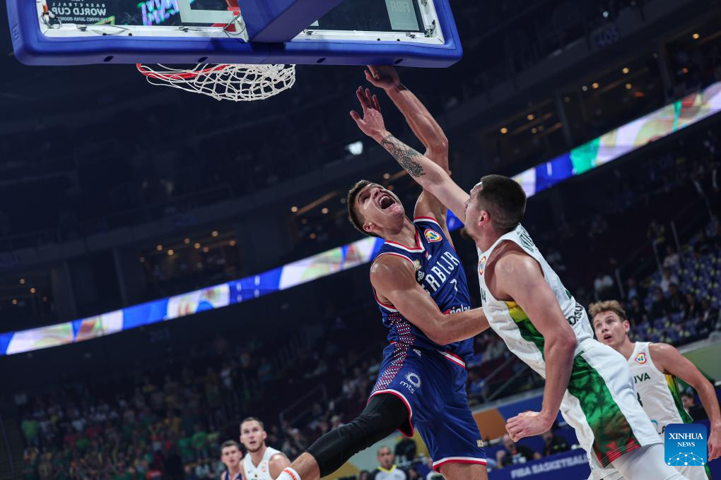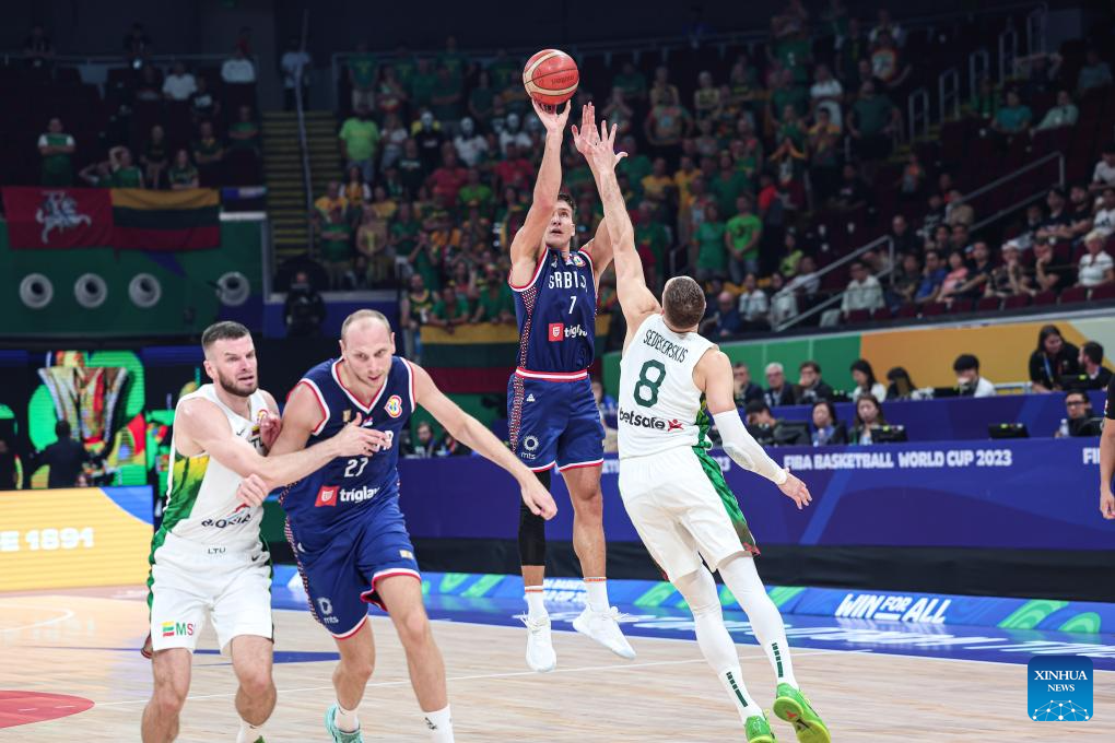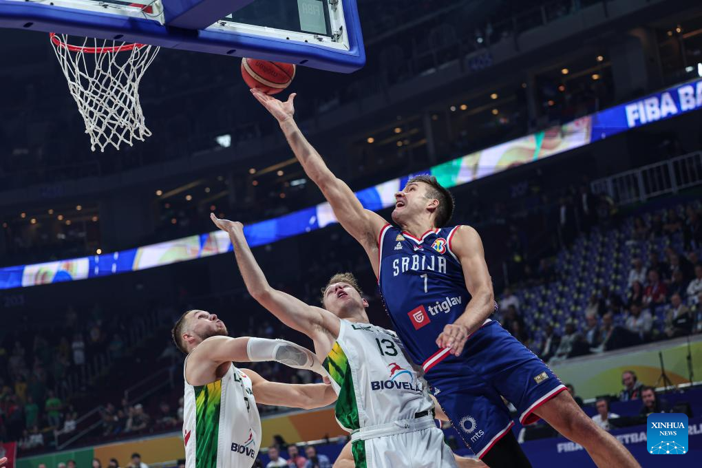 Dejan Davidovac (C) of Serbia vies for the ball during the quarterfinal between Lithuania and Serbia at the 2023 FIBA World Cup in Manila, the Philippines, Sept. 5, 2023. (Xinhua/Wu Zhuang)