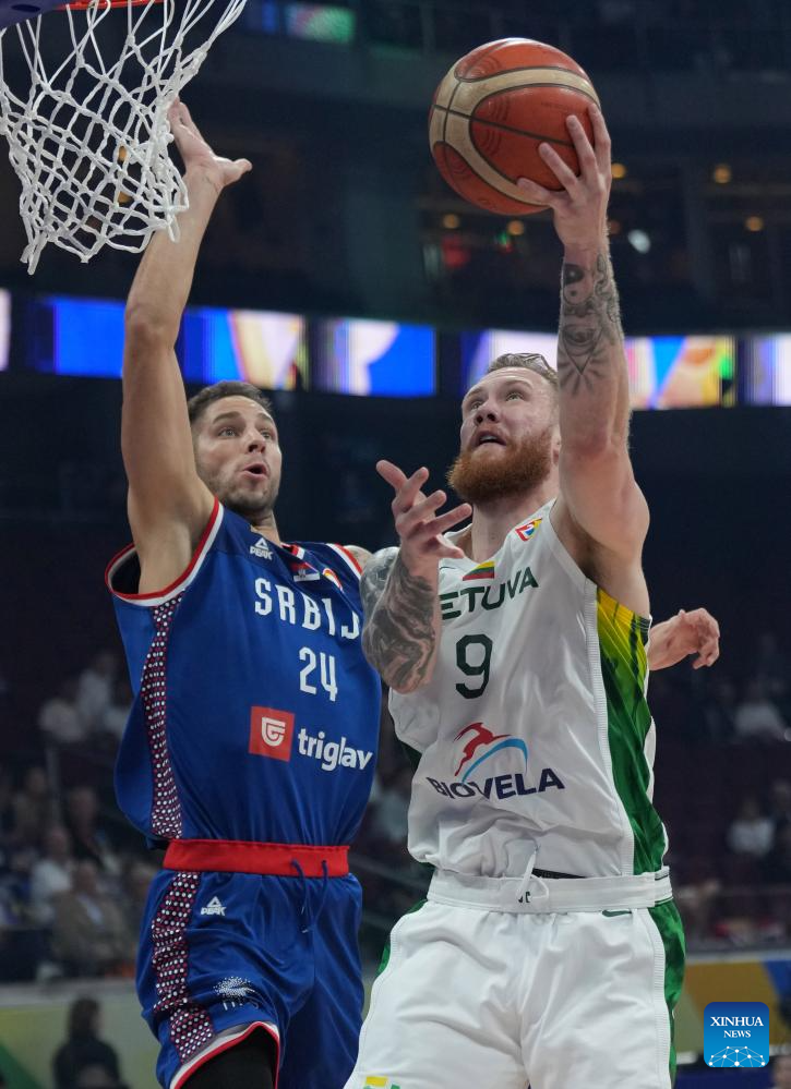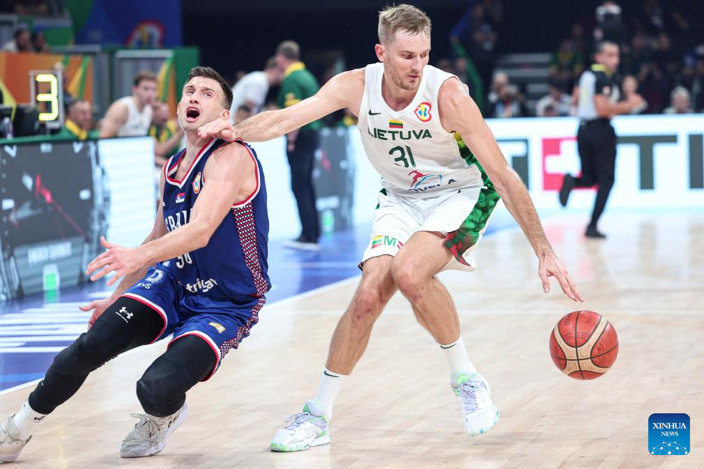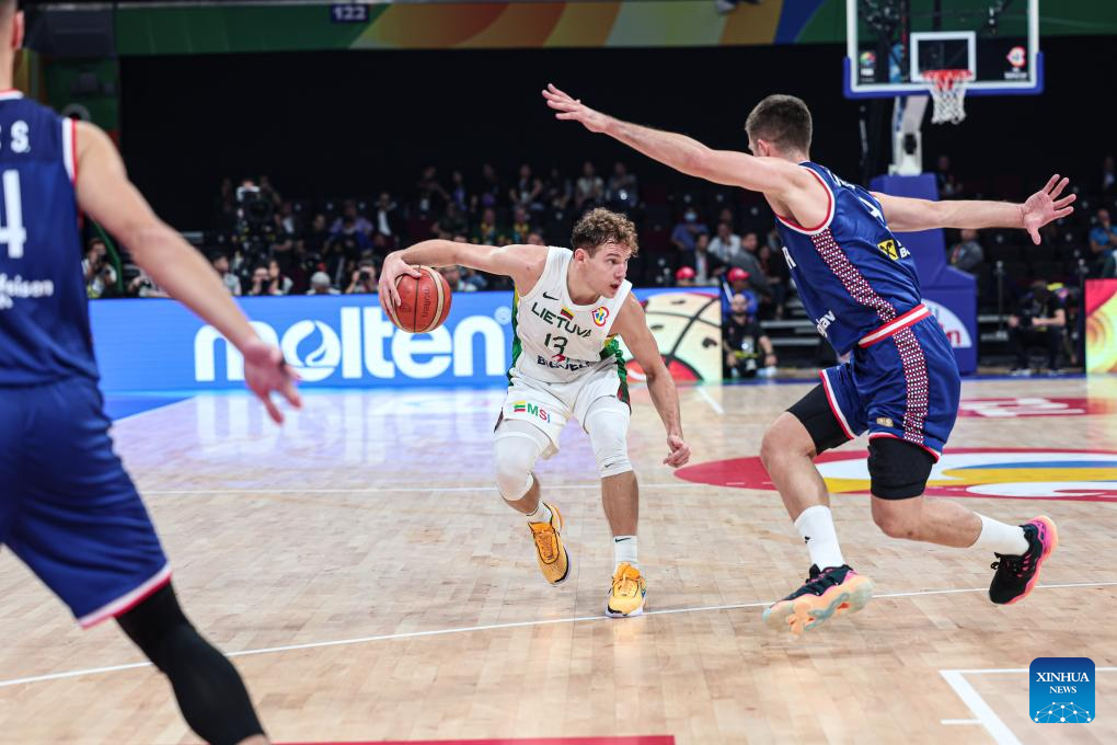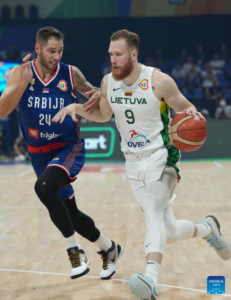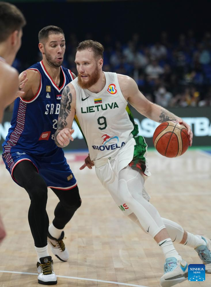 Ignas Brazdeikis (2nd R) of Lithuania drives the ball during the quarterfinal between Lithuania and Serbia at the 2023 FIBA World Cup in Manila, the Philippines, Sept. 5, 2023. (Xinhua/Wu Zhuang)