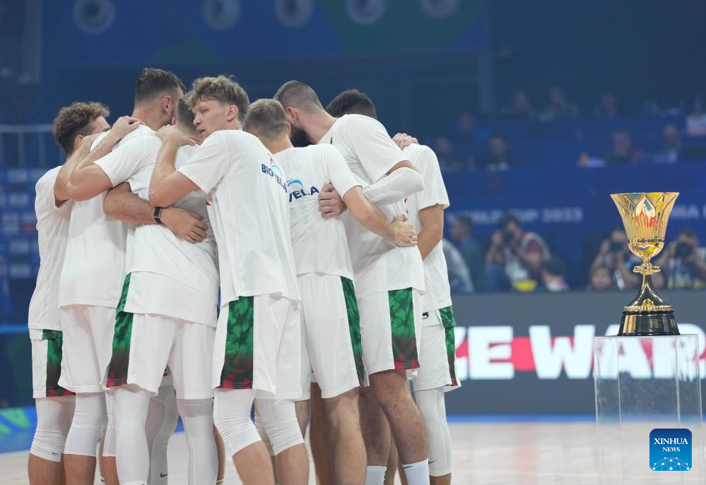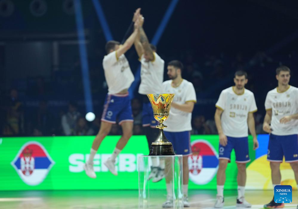 Serbia's players cheer up before the quarterfinal between Lithuania and Serbia at the 2023 FIBA World Cup in Manila, the Philippines, Sept. 5, 2023. (Xinhua/Meng Yongmin)