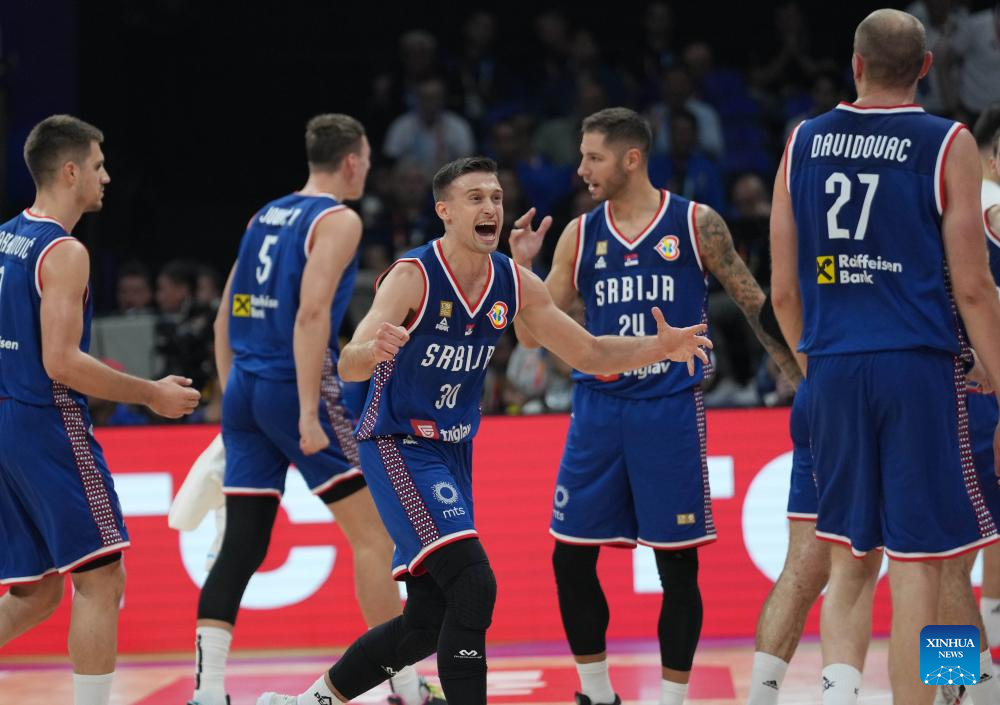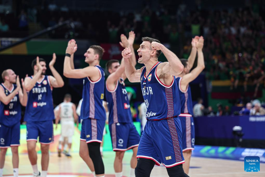 Players of Serbia celebrate after winning the quarterfinal between Lithuania and Serbia at the 2023 FIBA World Cup in Manila, the Philippines, Sept. 5, 2023. (Xinhua/Wu Zhuang)