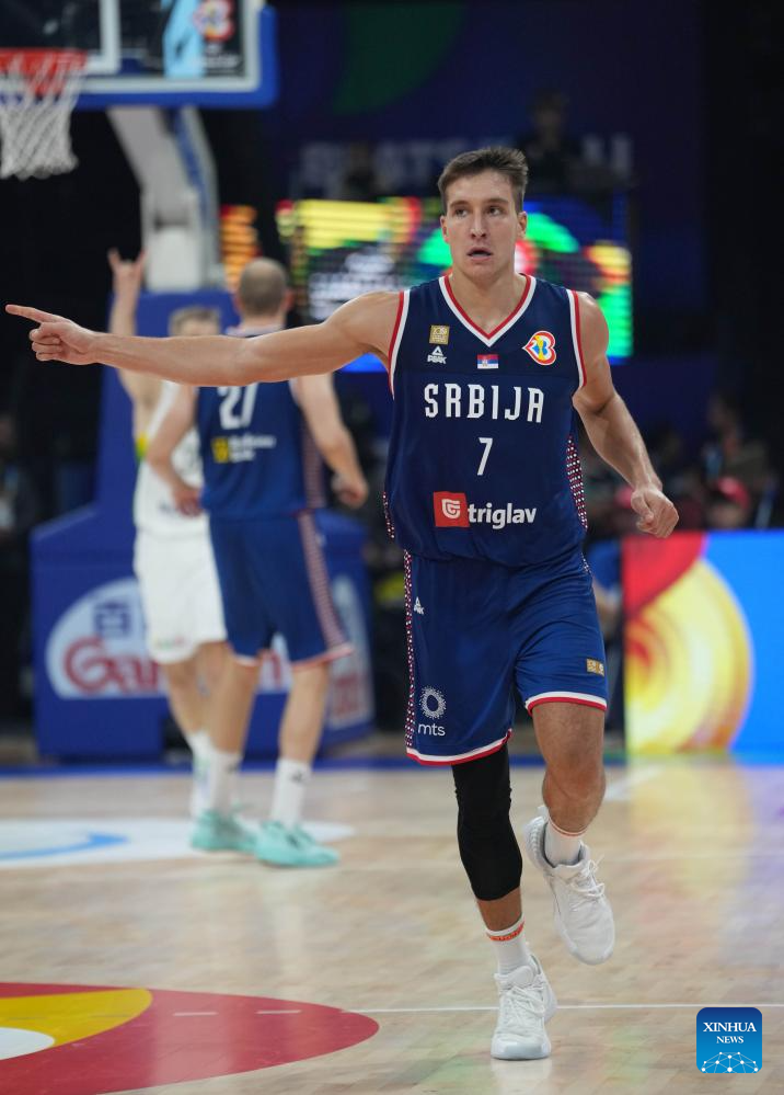 Serbia's Bogdan Bogdanovic celebrates during the quarterfinal between Lithuania and Serbia at the 2023 FIBA World Cup in Manila, the Philippines, Sept. 5, 2023. (Xinhua/Meng Yongmin)