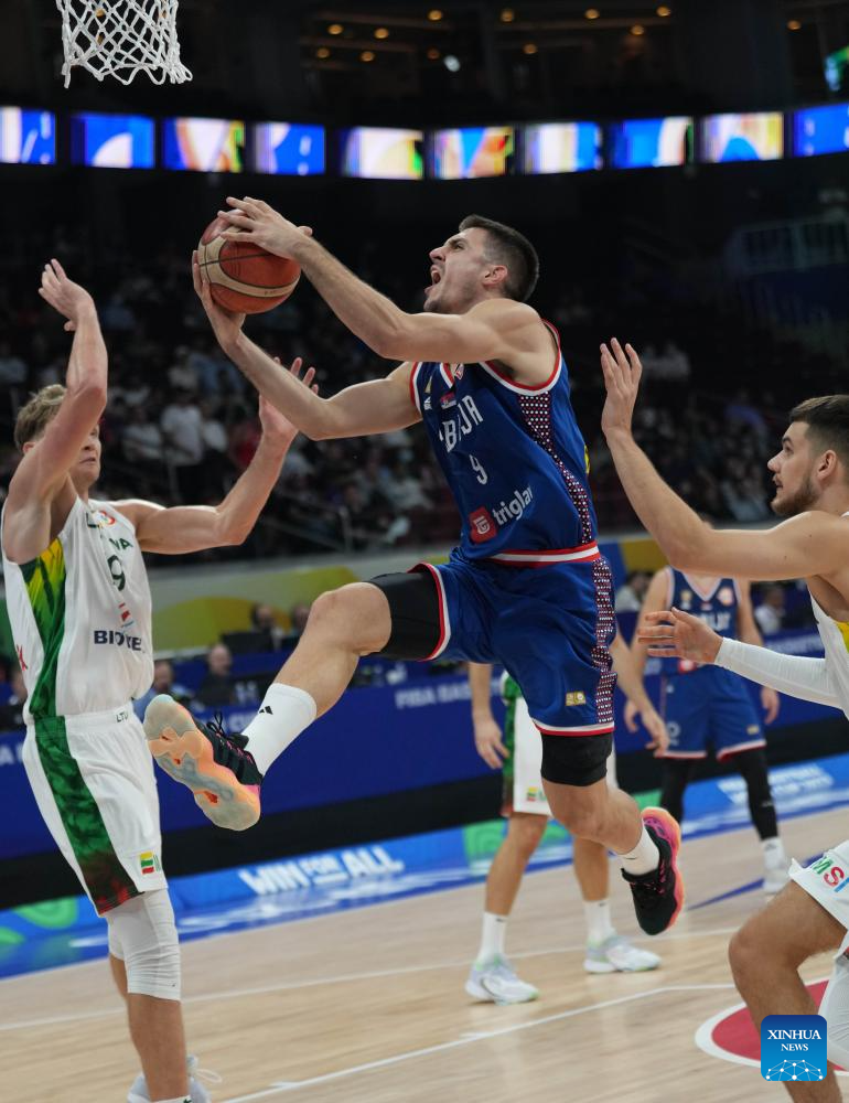 Vanja Marinkovic (C) of Serbia goes for a basket during the quarterfinal between Lithuania and Serbia at the 2023 FIBA World Cup in Manila, the Philippines, Sept. 5, 2023. (Xinhua/Meng Yongmin)