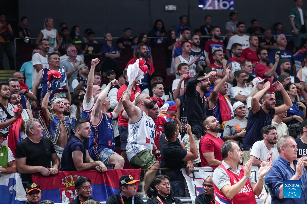 Fans of Serbia cheer during the quarterfinal between Lithuania and Serbia at the 2023 FIBA World Cup in Manila, the Philippines, Sept. 5, 2023. (Xinhua/Wu Zhuang)