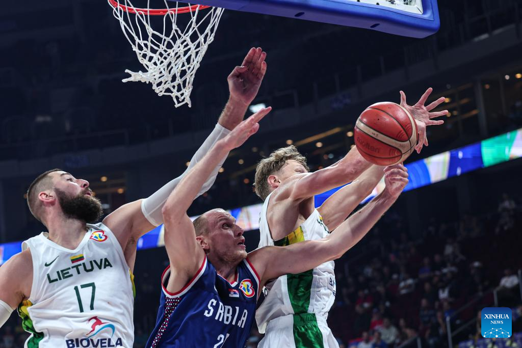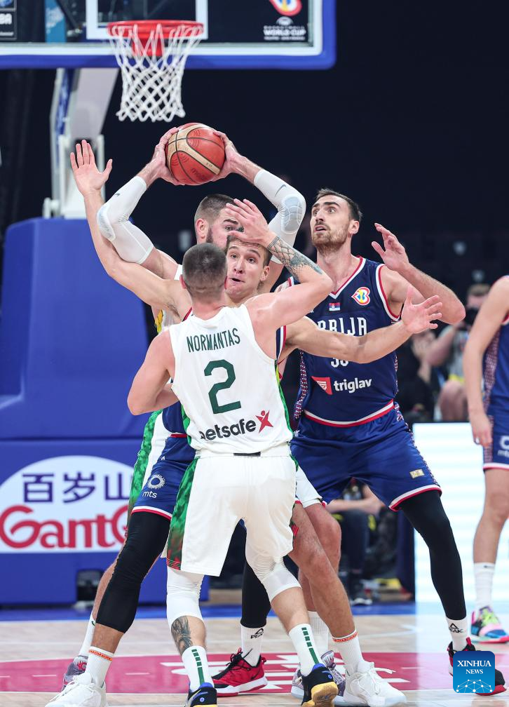 Lithuania's Ignas Brazdeikis (1st L) competes during the quarterfinal between Lithuania and Serbia at the 2023 FIBA World Cup in Manila, the Philippines, Sept. 5, 2023. (Xinhua/Meng Yongmin)