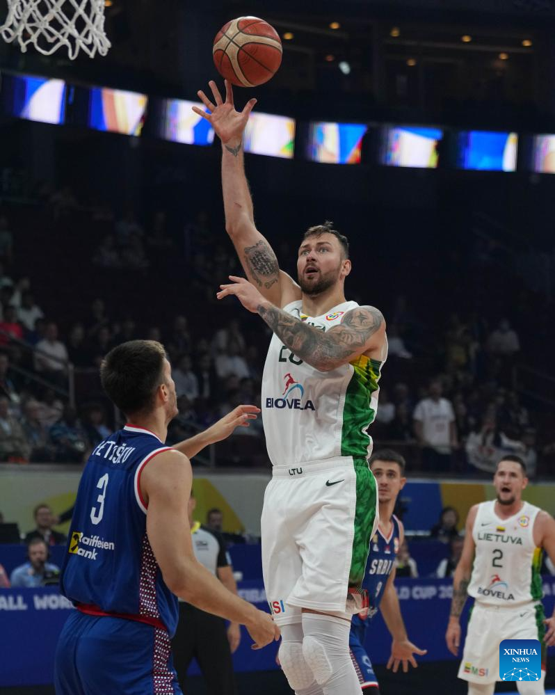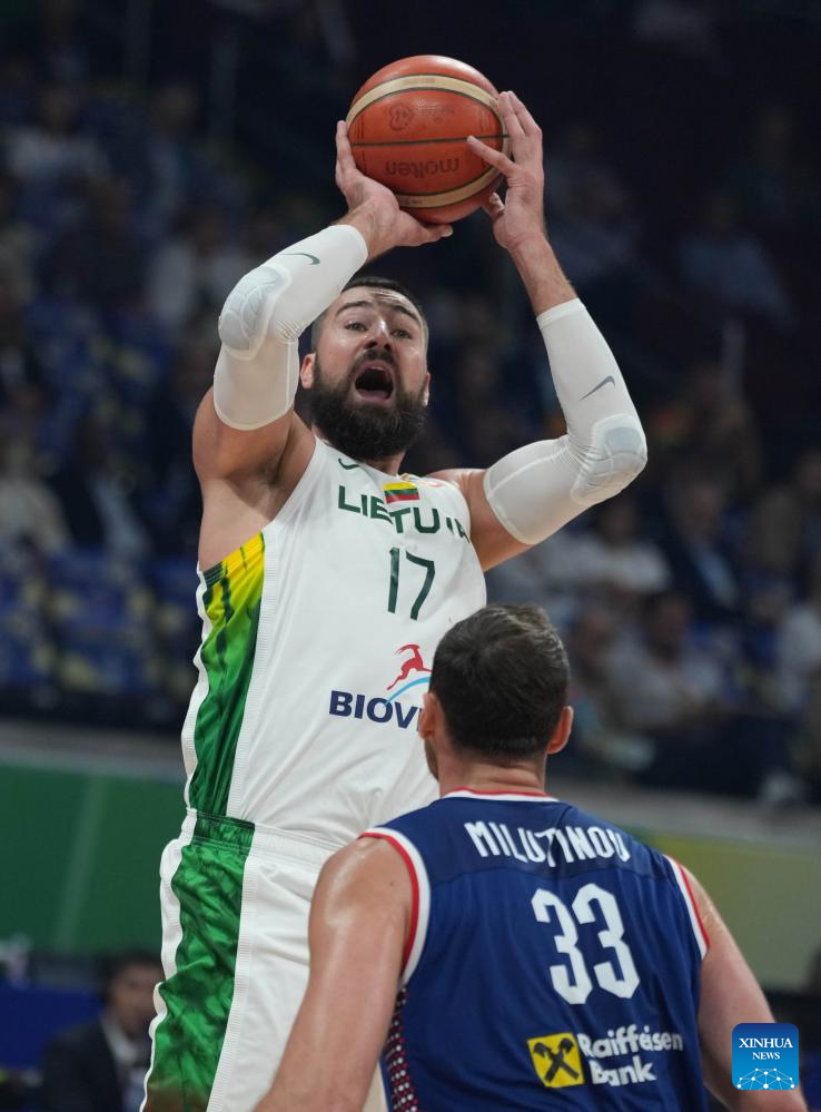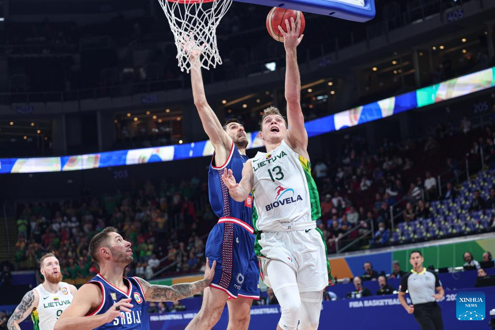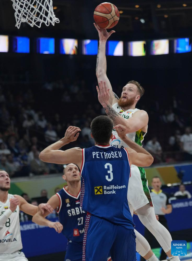 Lithuania's Ignas Brazdeikis (C) competes during the quarterfinal between Lithuania and Serbia at the 2023 FIBA World Cup in Manila, the Philippines, Sept. 5, 2023. (Xinhua/Meng Yongmin)